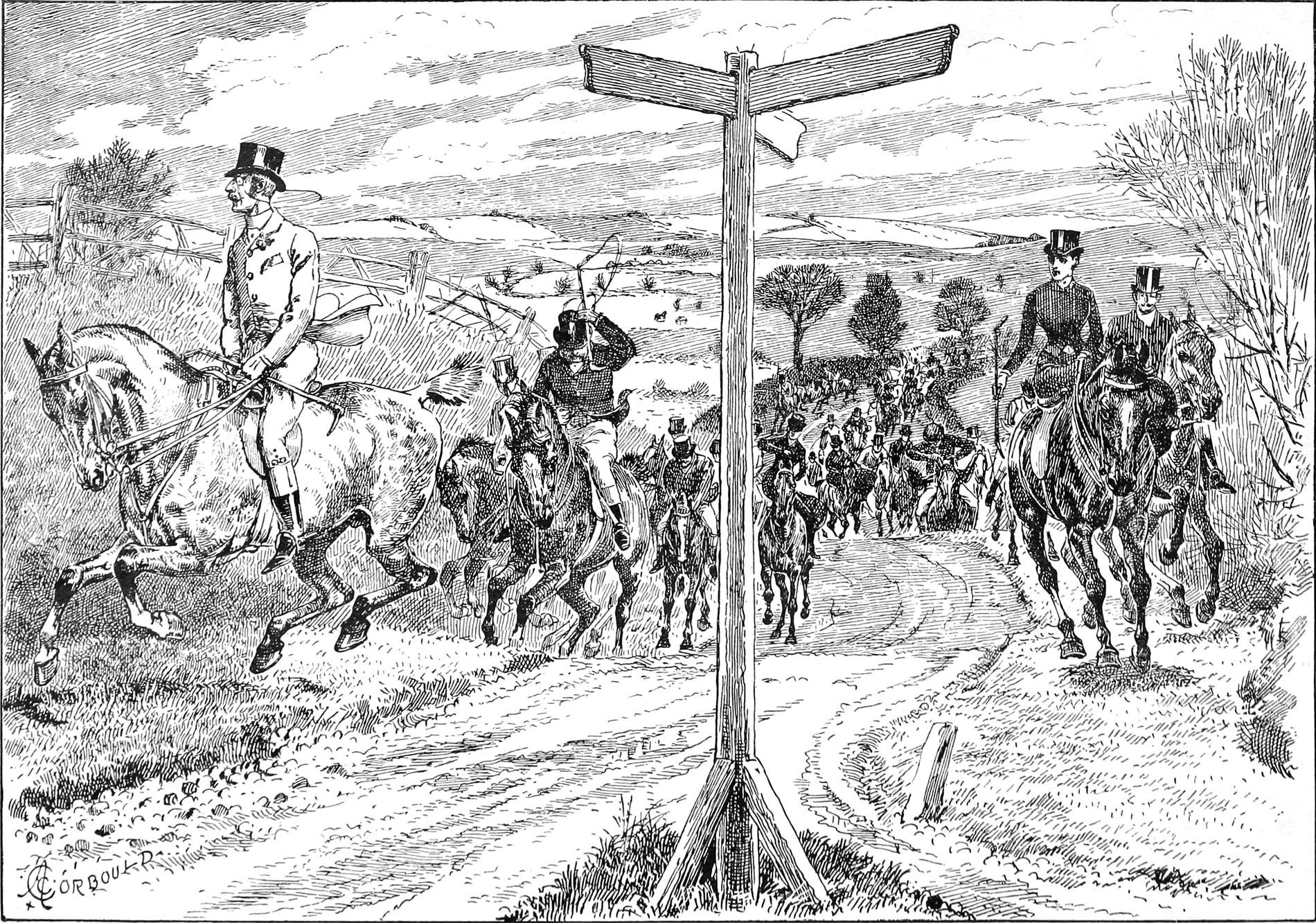 | “ONE FAIR PURSUER GOES AT IT WHERE THE HUNTSMAN LEADS.” March, 1889. A. C. Corbould | |