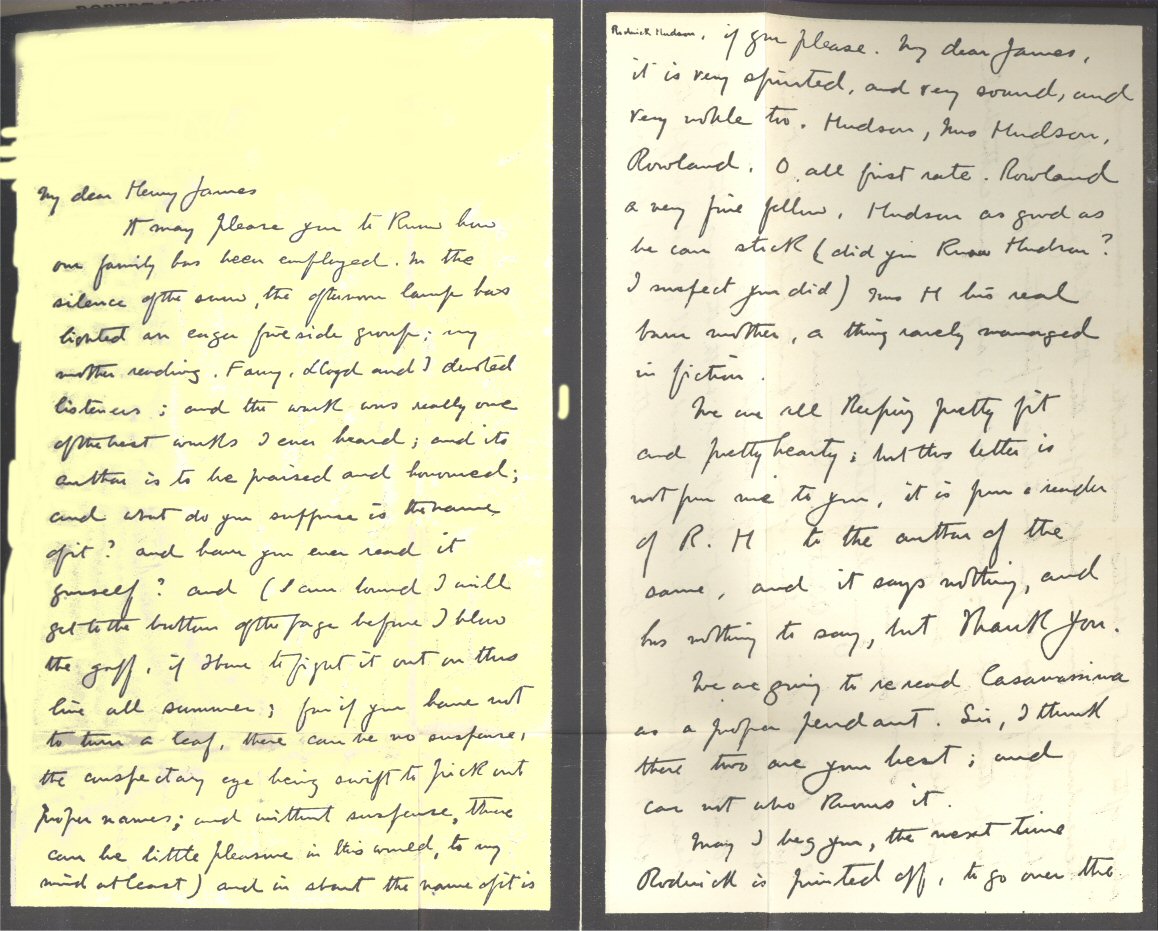 MY DEAR EELES,—The hand, as you will perceive (and also the spelling!), is Teuila’s, but the scrannel voice is p. 366what remains of Tusitala’s. First of all, for business. When you go to London you are to charter a hansom cab and proceed to the Museum. It is particular fun to do this on Sundays when the Monument is shut up. Your cabman expostulates with you, you persist. The cabman drives up in front of the closed gates and says, ‘I told you so, sir.’ You breathe in the porter’s ears the mystic name of Colvin, and he immediately unfolds the iron barrier. You drive in, and doesn’t your cabman think you’re a swell. A lord mayor is nothing to it. Colvin’s door is the only one in the eastern gable of the building. Send in your card to him with ‘From R. L. S.’ in the corner, and the machinery will do the rest. Henry James’s address is 34 De Vere Mansions West. I cannot remember where the place is; I cannot even remember on which side of the park. But it’s one of those big Cromwell Road-looking deserted thoroughfares out west in Kensington or Bayswater, or between the two; and anyway, Colvin will be able to put you on the direct track for Henry James. I do not send formal introductions, as I have taken the liberty to prepare both of them for seeing you already.