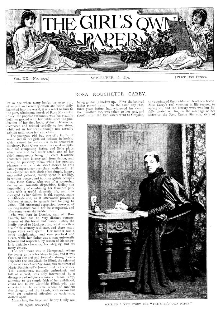 In an age when many books on every sort of subject and vexed question are being daily launched into the world, it is a relief to turn to the pure, wholesome novels of Rosa Nouchette Carey, the popular authoress, who has steadily held her ground with her public since the production of her first book, Nellie’s Memories, composed and related verbally to her sister, while yet in her teens, though not actually written until some few years later.