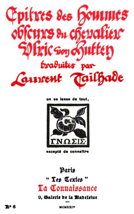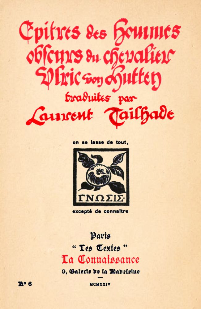Les Épîtres des hommes obscurs du Chevalier Ulrich von Hutten ont été traduites par Laurent Tailhade. Ce livre est le 6e de la Collection Les Textes, éditée par la maison à l'enseigne « La Connaissance» et sous la devise : On se lasse de tout excepté de connaître, sise à Paris, 9, galerie de la Madeleine. L'édition est précédée d'une étude de Laurent Tailhade sur Luther.