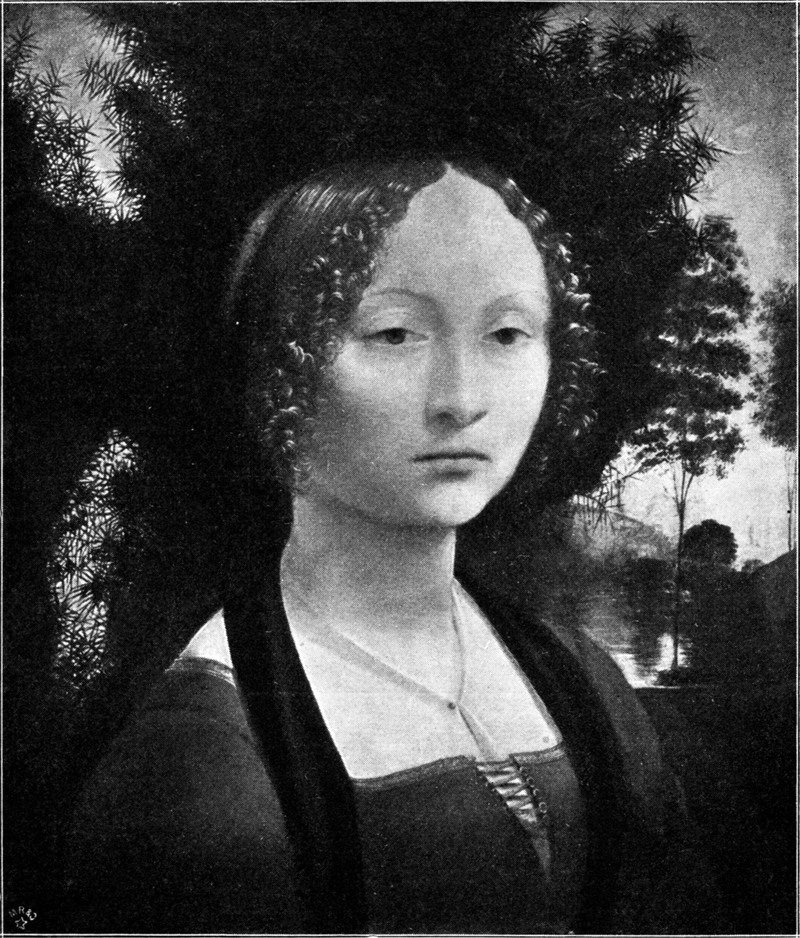 Der Kreis der Malereien, die mit Verrocchio im Zusammenhang stehen, ist damit noch nicht geschlossen, doch steht das, dessen Betrachtung etwa noch übrig bliebe, in zu losem Zusammenhang mit der eigenen meisterlichen Hand, um hier weiteren Raum in Anspruch zu nehmen. Dem Gegenstande nach fallen darunter am meisten ein paar Frauenköpfe in Berlin und in Wien auf. Aus dem Memorandum des Tommaso erfahren wir, daß Andrea für Lorenzo de’ Medici das Bildnis der Lucrezia de’ Donati gemalt habe, der zu Ehren Lorenzo 1469 das von Pulci besungene Turnier veranstaltete. Das Berliner Bildnis (Abb. 70)[S. 87] mit der ebenso drohenden wie verlockenden Inschrift: „Rühr mich nicht an“ auf der Vorderseite und der hoffnungslosen Liebesklage auf der Rückseite: „Kaum ich’s besessen, mußt’ ich’s auch beweinen“ bietet sich allerdings zu der Vermutung an, hier sei Lorenzos Geliebte von Verrocchios Hand gemalt erhalten. Ein zarter Liebesroman scheint sich von einem Spruch zum anderen herüberzuweben. Aber das Gemälde selbst trägt, wie ich meine, so deutlich alle Spuren der jugendlichen Hand des Lorenzo di Credi, die mit der glatten Technik eines Emailmalers wetteifert, daß sich die Phantasie von dem schmachtenden und gequälten Pärchen darüber verflüchtigen muß. Nicht minder halte ich das Wiener Frauenbildnis beim Fürsten Liechtenstein (Abb. 20) für das Werk eines Verrocchio-Schülers und zwar keines geringeren als des Leonardo da Vinci (vgl. auch S. 46).