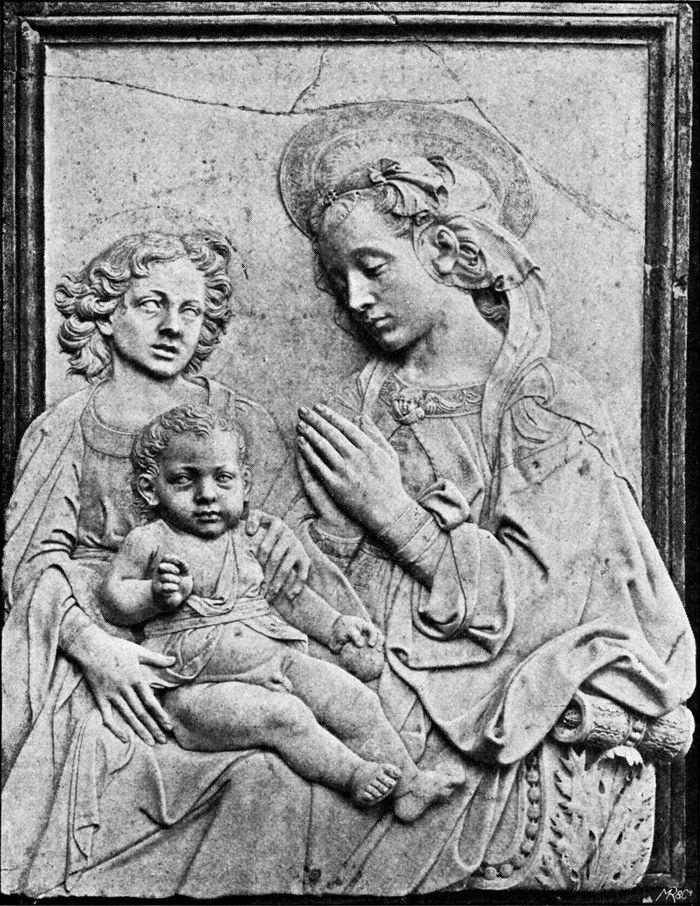 Auf der weiteren Umschau nach dem Lehrmeister ist es verlockend, bei Bernardo Rossellino zu verweilen. Nach Vasari soll nämlich der junge Verrocchio die Madonna mit den Engeln in der Lünette des Brunigrabes in S. Croce gearbeitet haben. Aber auch hier überwiegen chronologische und technische Bedenken. Leonardo Bruni, der Staatssekretär der florentiner Republik, starb 1444; es ist nicht anzunehmen, daß man die Ehrung des verdienstvollen Staatsmannes und Historiographen der Republik hinausgezögert habe. Einem Acht- oder Neunjährigen, wie Verrocchio zu dieser Zeit war, wird man aber keine Marmormadonna zutrauen wollen, auch nicht, wenn sie, wie die in Frage stehende, künstlerisch den übrigen Teilen des Grabmales unterlegen ist.