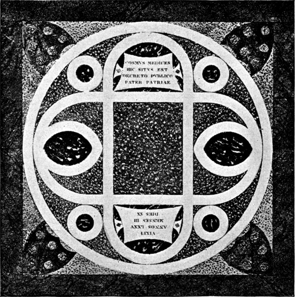 Als Cosimo der Alte 1464 starb, scheint man zum erstenmal Verrocchios künstlerische Hand in Anspruch genommen zu haben. Die Signorie, die ein pomphaftes Grabmal mit Ehrenstatue erwog, konnte sich nicht schlüssig machen, und so ist es bei dem schlichten Grabstein geblieben, den die Familie vor dem Hauptaltar von San Lorenzo über der unterirdischen Gruft in den Fußboden senken ließ. Entwurf und Ausführung rühren von Verrocchio her (Abb. 3). Der Stein besteht in einer quadratischen Platte, die ein geometrisches Muster, in buntem Marmor ausgeführt, aufweist. Jedes christliche Zeichen oder Symbol fehlt. Die Zeichnung ist einfach: in den viereckigen Rahmen ist ein Kreis eingeschrieben, der seinerseits zwei sich kreuzende Ellipsen einschließt; die Ecken füllen Wappen mit den Kugeln der Medici. Der Reiz des Ganzen beruht in der Farbigkeit, die durch verschiedenartige Steine und durch Verwendung der Bronze für die Wappenschilde erzielt wird. Wir werden noch an anderen Arbeiten sehen, wie sehr Verrocchio die farbige Inkrustation, namentlich die Verbindung von Bronze mit buntem Stein bevorzugt und sie, wo er kann, mit feinem Geschmack verwendet. Die vertikalen Arme der einen Ellipse enthalten auf trapezförmigen Marmorplatten in Bronzebuchstaben die Inschrift, die als einzigen Ruhmestitel des Verstorbenen den ihm öffentlich zuerkannten Ehrennamen des pater patriae enthält. Von der empörten Volksmenge ist auch diesem Grabstein trotz seiner Schlichtheit übel mitgespielt worden (1494), und es bedurfte erst der Rehabilitierung der Familie, die Greuel der Verwüstung zu tilgen und für die Wiederherstellung zu sorgen.