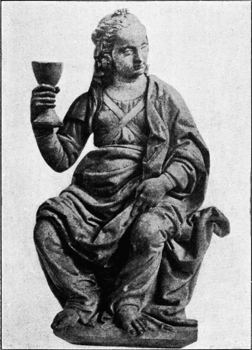 Die Madonna mit dem hl. Leonardus und dem hl. Julian (?) im Museum zu Neapel (Abb. 77) steht auf der gleichen Stilstufe und teilt, bei geringerer Erhaltung, alle Eigenschaften des Pistojeser Bildes. Credi hat späterhin noch mehrfach von diesem in der Verrocchio-Werkstatt üblichen Kompositionsschema Gebrauch gemacht. Auch in seinen Gestalten spürt man bis an sein spätes Lebensende die unauslöschliche Erinnerung an seinen Meister. Credis Kinderfiguren hängen alle von Verrocchios Vorbild ab. In einem sorgfältig durchgeführten Bilde der büßenden Magdalena im Berliner Museum überträgt[S. 97] er eine gelegentliche, durch besonders feine Bemalung ausgezeichnete Statuette Verrocchios, ebenfalls im Berliner Museum (Abb. 78) ohne wesentliche Änderung auf die Holztafel.