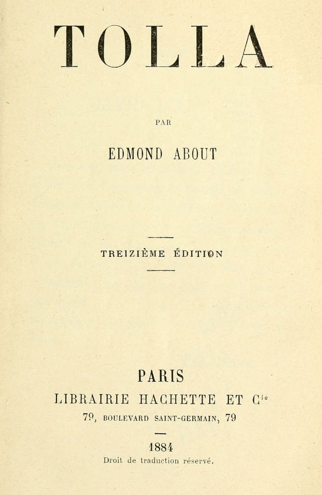 Vous connaissez les Italiens, Madame, et vous savez qu'à leurs yeux le monde est peuplé de bonnes et de mauvaises influences. Pour moi, je crois surtout aux bonnes, et je me persuade qu'un grand nom doit porter bonheur à un petit livre, et que le patronage d'une belle âme, saine et vigoureuse, est un puissant renfort pour un esprit hésitant et à peine formé. C'est dans cette superstition que j'ose vous dédier l'histoire de Tolla.
