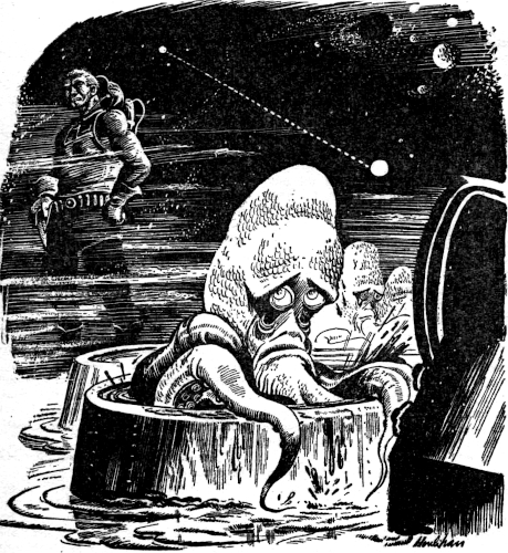 Ullo snapped his tentacle tip quietly in assent. He remembered from his history the dreadfully long period of his own race's expansion throughout the system of Zillor. These Earthmen, however, seemed from Zoya's report to possess certain advantages. Their requirements of air and water were moderate and more easily stored in a space vessel. If they had discovered a form of subspace drive, they might be energetic enough to pop up in the vicinity of Zillor some fine day.