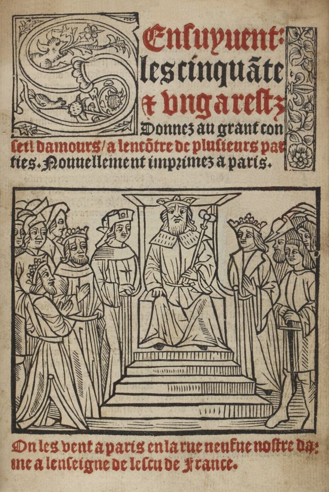 ¶ Cy finissent les cinquante et ung arrest d'amours. Nouvellement imprimé a paris par la veufve feu Jehan trepperel et Jehan jehannot Imprimeur et Libraire juré en l'université de paris Demourant en la rue neufve nostre dame a l'enseigne de l'escu de France.