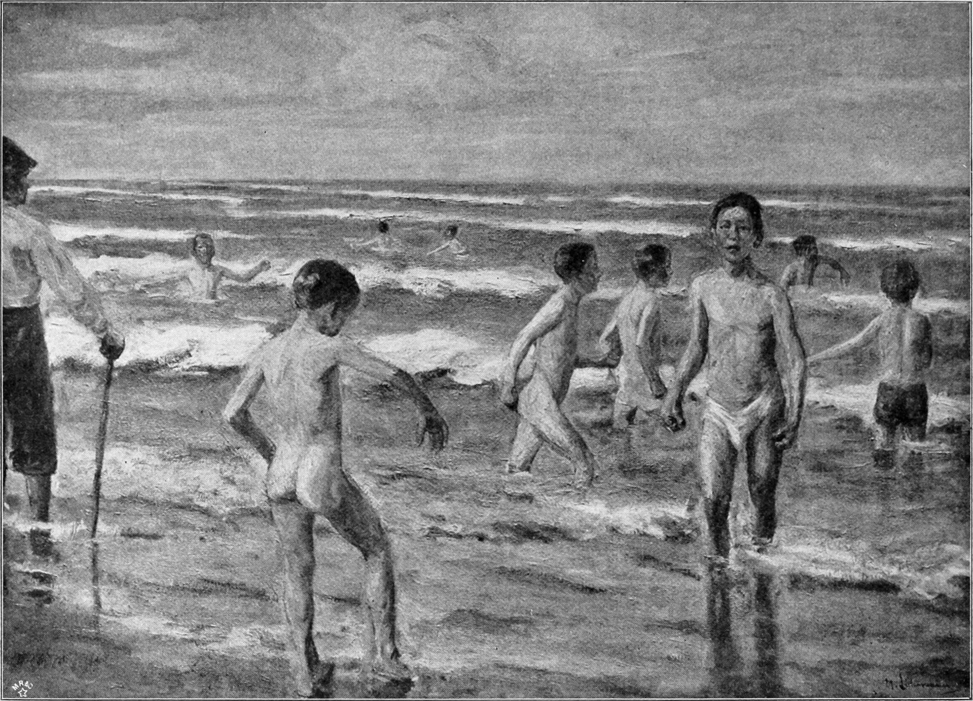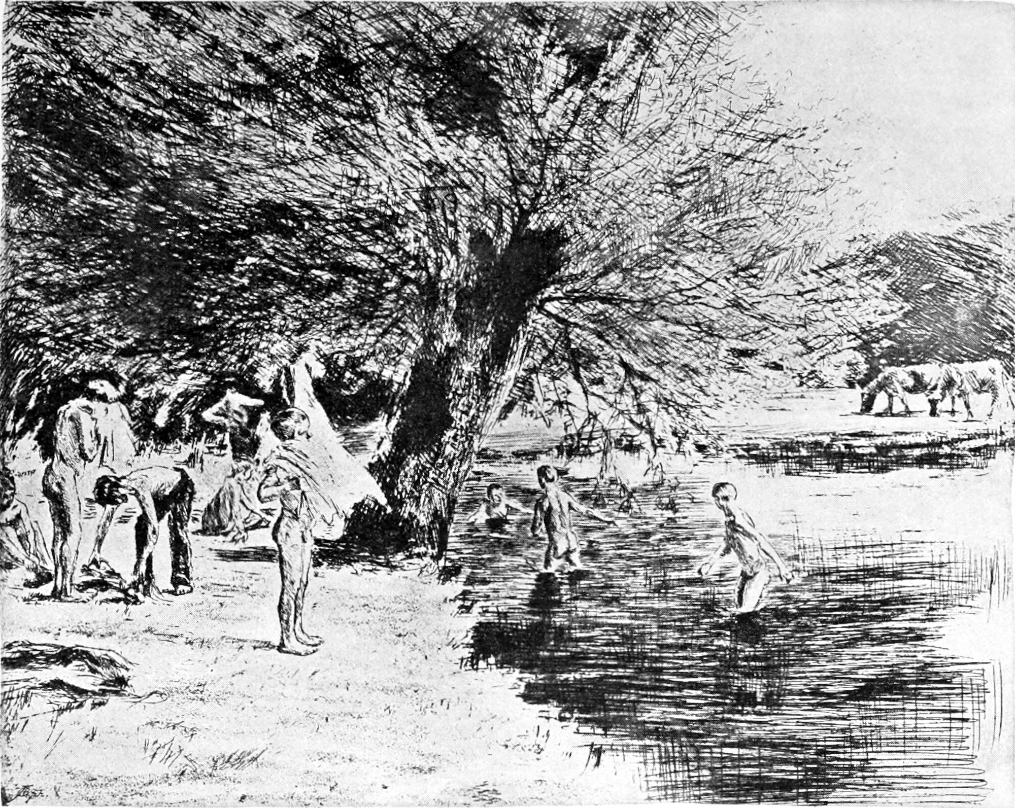 Immer lebhafter fühlt sich der Künstler von solchen schwierigen Lichtproblemen angezogen. Es reizt ihn, den Glanz der Sonne auf unbekleideten Menschenkörpern zu malen, Reflexe wiederzugeben, die von lichtgetroffenem Wasser und blitzendem Dünensande herrühren, und er nimmt nach einem Aquarell, das badende Jungen an[S. 47] einem Landsee zeigt, — auch als Radierung vorhanden (Abb. 84) — das große Bild „Badende Jungen in Zantvoort“ (Abb. 86) in Angriff. Liebermanns Farben sind nie die hellsten gewesen, und es ist nicht unwahrscheinlich, daß seine „Badenden Jungen“ etwa neben der bekannten „Badenden“ von Anders Zorn trübe und grau wirken würden; aber an sich ist das Liebermannsche Bild so hell, so voll von Sonne, daß man förmlich geblendet ist, wenn man längere Zeit auf diese von strahlendem Licht überschütteten Knabenkörper, die glänzendweißen Hemden, den blinkenden Dünensand, das funkelnde Wasser geschaut hat. Und welche Lichtwogen wirft erst der halbbedeckte Himmel dem Beschauer ins Auge! Dabei ist nicht eine harte Farbe, kein einziger starker Kontrast in dem Bilde. Milde und weich umflutet die feuchte Luft alles: Land, Wasser und Menschen. Zugleich bietet das Bild eine Fülle von Bewegungsmotiven. Alle Stadien des Anziehens und des Abtrocknens. Diesen „Badenden Jungen“, die allerdings bereits gebadet haben, von 1896 hat Liebermann 1899 eine wirkliche Badescene entgegengesetzt, die die Jungen im Wasser zeigt, unter leicht bedecktem Himmel, noch überzeugender und bei aller Helligkeit wunderbar stark in der Farbe (Abb. 112). Ein Meisterwerk!