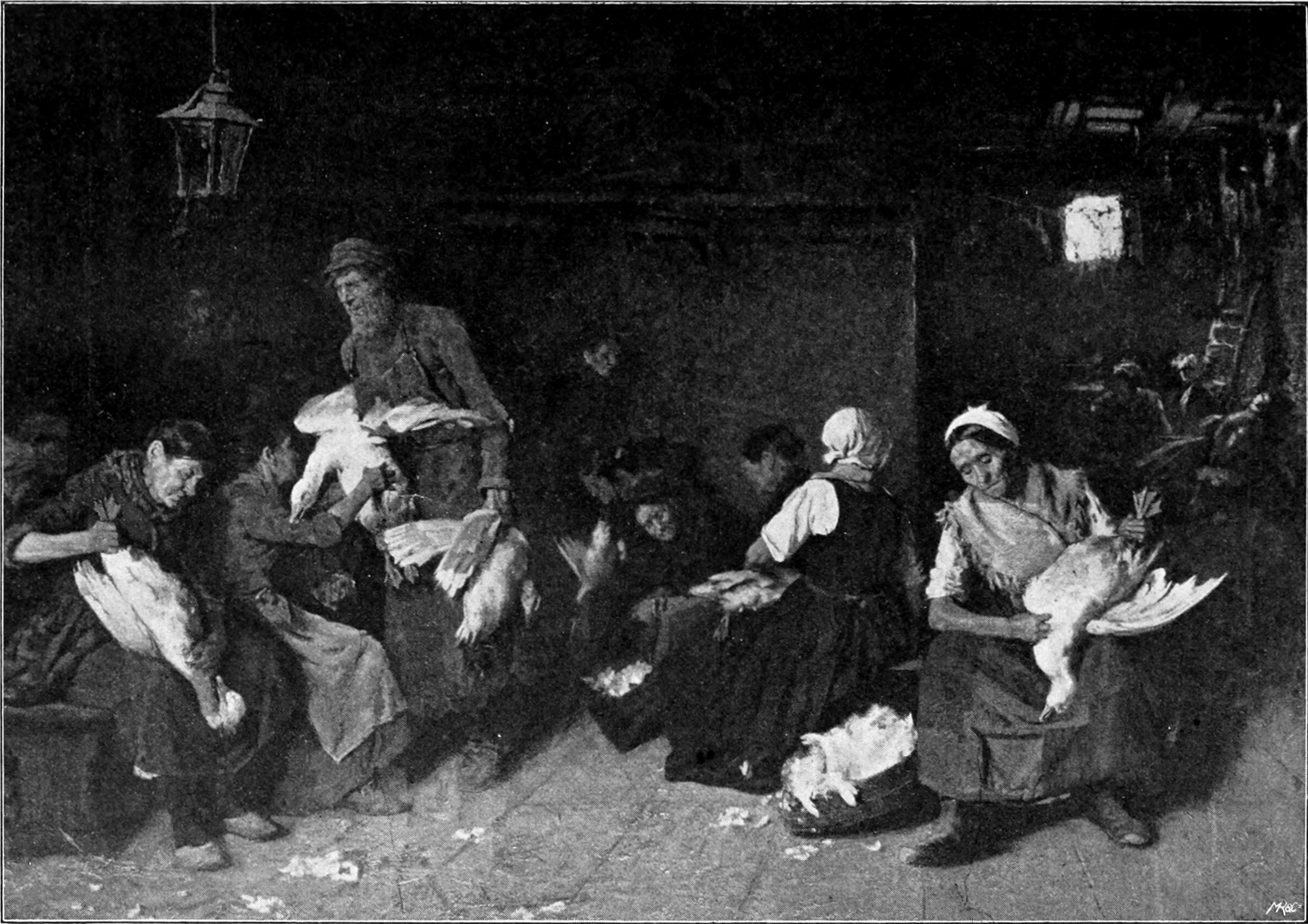 Es liegt eine gewisse Ungerechtigkeit darin, Liebermann immer als den Nachfolger, wenn nicht gar Nachahmer Millets hinzustellen, auch hinsichtlich seines Stoffgebietes. Wenn er nicht über Millet hinausgekommen wäre, so würde man ebensowenig von ihm sprechen, wie man von Fritz Werner spricht, der sich bemühte, die Wege Menzels[S. 62] zu gehen. Man unterschätzt Liebermanns künstlerische Gesinnung und die neue Schönheit, die er in die Kunst gebracht hat, wenn man ihren Ursprung außer ihm sucht und zu finden meint. Niemand wird leugnen, daß er derjenige war, der in Deutschland den Blick auf die Wandlungen gelenkt hat, die in der französischen Kunst seit 1860 vor sich gegangen waren, und so gleichsam ein Apostel neuer künstlerischer Lehren geworden ist; wäre aber nicht zugleich ein starker Strom persönlicher künstlerischer Macht von ihm ausgegangen, so würde man sich in Deutschland vielleicht heute noch nicht viel um Millet und seine künstlerischen Grundsätze bekümmern. Millet hat Barbizon entdeckt, mit seinen stillen, wehmütigen Bauern, die, als verrichteten sie feierliche Handlungen, das Feld bestellen, Bäume fällen, Strümpfe stricken und Ähren sammeln. Liebermann zog für die Mitwelt den Schleier fort, hinter dem eine vergessene Welt lag, voll Eigenart und Schönheit; er that die Thüren auf zu den Schatzkammern, aus denen die feinsten Maler des siebzehnten Jahrhunderts geschöpft, er fand Holland wieder, das malerischste Land der Welt. Die Rousseau, Troyon, Daubigny, Dupré, die Ehrwürdigen von Fontainebleau hatten die Prinzipien der holländischen Landschafter des siebzehnten Jahrhunderts für die Gegenwart lebendig gemacht. Liebermann ging zu den Quellen. Er hatte den Mut, sich nicht darum zu kümmern, was und wo die anderen gemalt; er sah selbst zu, was es zu malen gab. Diese Selbständigkeit im Ermitteln von malerischen Motiven kündigt sich freilich in seinem ersten Bilde, den „Gänserupferinnen“, noch nicht an. Die Idee zu solchen Bildern lag in der Luft. Paul Meyerheim hatte 1871 eine „Schafschur“ gemalt. Es sei ferner an Hirth du Frênes’ „Hopfenernte“ erinnert, auf der sich sogar auch der dem Ostade, Jan Steen oder irgend einem anderen der holländischen Sittenmaler abgesehene Lichteffekt mit dem Fenster im Hintergrunde und den darunter in schummeriger Beleuchtung stehenden Personen vorfindet. Nur daß Rudolf Hirth noch nicht so völlig darauf verzichtet hatte, dem Publikum etwas zu erzählen und inmitten der in ihre Arbeit vertieften Weiber[S. 63] ein Liebespaar setzt. Auch Liebermanns erste „Konservenmacherinnen“ — die Abb. 3 gibt die zweite Wiederholung; das im Leipziger Museum befindliche 1878 gemalte Bild hat damit weder in Farbe noch Komposition Ähnlichkeit — zeigen noch keine veränderte künstlerische Anschauung. Das Licht- und Schattenspiel rechts im Hintergrunde ist beibehalten. Aber schon in den „Invaliden“ von 1874 kündigt sich die Gabe Liebermanns, eigenartige neue Motive aus der Wirklichkeit herauszusehen, an, und auch die künstlerische Idee gelangt fester und stärker zum Ausdruck. War auf den ersten Bildern die Lichtquelle im Hintergrunde nur Episode, um dessen nächtliche Schwärze aufzulichten, so ist sie hier eben schon hauptsächliche künstlerische Idee, mit Verständnis, aber noch nicht eigentlich in einem neuen Sinne durchgeführt. Auch der „Bauernhof“ von 1875 (Abb. 6) zeigt ein damals noch ungewöhnliches Motiv, zugleich aber schon ein bemerkenswert sicheres Gefühl für die Verteilung der hellen und dunklen Flecken im Bilde.