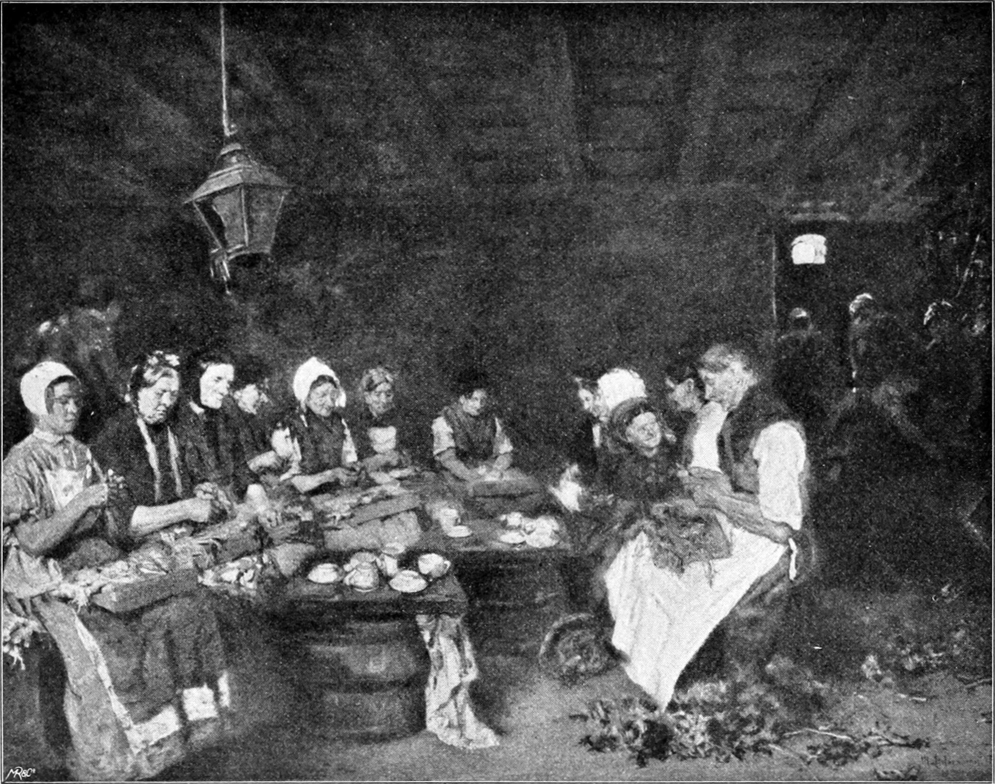 In den „Konservenmacherinnen“ und in den „Invaliden im Lotsenhaus“ beginnt sich der schwärzliche Ton der Liebermannschen Bilder schon aufzulichten. Statt Beinschwarz verwendet der Künstler Asphalt, auf dessen durchsichtigem Braun die Farben anfänglich warm und leuchtend stehen, um allerdings später durch die zersetzende Kraft des Bitumens stumpfer zu werden. Nach der psychologischen Seite ist ein außerordentlicher Fortschritt zu konstatieren. Die „Konservenmacherinnen“ (Abb. 3) — derbe, kräftige Weiber, abgerackerte Arbeitsfrauen und wunschlos gewordene alte Mütterchen — sitzen auf hölzernen Bänken und Fässern in einem dunklen, niedrigen Arbeitsraume an einem improvisierten Tische und putzen mit kurzen Messern die verschiedenartigsten Gemüse. Kein Blick aus all’ den Augen fällt auf den Beschauer. Keine der Arbeiterinnen hat eine Empfindung davon, daß eines Malers Auge auf ihr geruht. Die unendliche Natürlichkeit in dem still vor sich Hinbrüten der Einen, die bewegliche Geschäftigkeit der Anderen, der unbewußte Ausdruck der zwölf oder dreizehn Gesichter gibt der Darstellung den wunderbarsten Reiz. Unwillkürlich gerät man in Versuchung, Charakterstudien zu[S. 22] machen, und ist erstaunt, welche Fülle von Individualitäten der Künstler in diesem einen Bilde gibt. Freilich muß man lesen können in Menschengesichtern, wird dann aber von diesem Bilde die Überzeugung mitnehmen, daß sein Urheber den Menschen, die er dargestellt, bis ins Herz gesehen hat. Dieselbe vollendete Natürlichkeit zeigen die „Invaliden im Lotsenhause“ (Abb. 5). Dieses ruhige Herumsitzen in dem hohen verräucherten Raume um den qualmenden Kamin, halb nachdenklich, halb gedankenlos, entspricht auf das Vollkommenste dem Wesen der Männer, die gewohnt sind, wortlos ihre Pflicht zu thun. Auch hier wieder wirkliche Menschen, nicht bloße Typen, und das Rot in den Hemden der bedächtig ihre Thonpfeife rauchenden Seeleute mit ihren sonderbaren hohen Hüten von feinster malerischer Wirkung zwischen Schwarz und Braun.