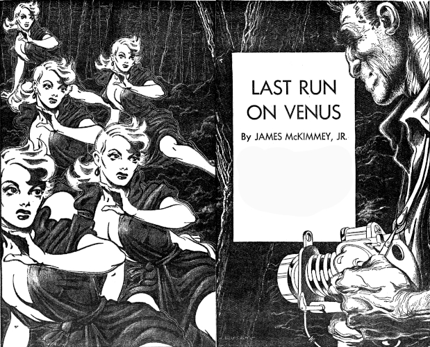 He watched, feeling the sweat on his forehead turn cold. This would be the way the Venusians would do it. Not force or violence, but this. A quiet, smooth absorption of the girl through illusion, the deadliest power of the Venusian. A hypnotic lock of his brain and hers so that instead of seeing four green-skinned Venusians and one girl, he saw five girls.