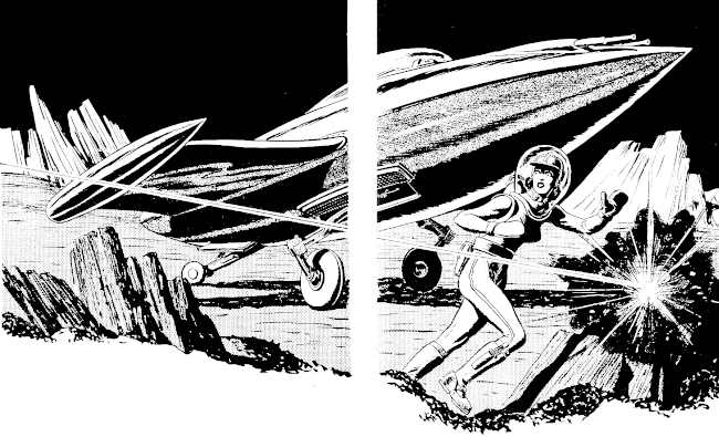 I heard Clair calling my name, "Jerry, Jerry!" and then 4270's jagged tumbling surface expanded up all around us and the planetoid didn't look so small any more. It looked huge, it could have been Jupiter. There came a grinding bump, and I thought I could hear my safety strap snapping. The black-light dials of the instrument panel zoomed up at me from someplace far beyond 4270, it seemed, and I met them head first with a hundred rocket tubes snorting inside my skull.