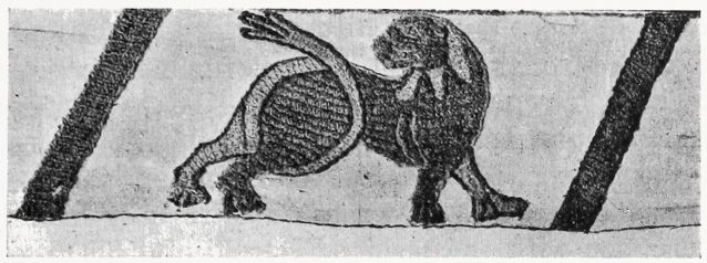 A word may be added about technique. The “Bayeux Tapestry” always has been, and probably always will be, known under this name. It should, however, be recognised that, properly speaking, it is not a tapestry at all but an embroidery.[1] The figures are worked on linen, probably unbleached, in wool of eight different shades: dark and light blue, red, yellow, dark and light green, black and dove colour. The Latin inscriptions that are placed over most of the scenes are also stitched in wool, and are about an inch in height. It is noticeable that no attempt has been made to give the objects the colours they have in nature, while a difference of colour is the method employed for such effects as perspective.{3} For instance, we see in the case of the horses the difference of the plane of their right and left legs is often suggested by a difference of colour.[2]