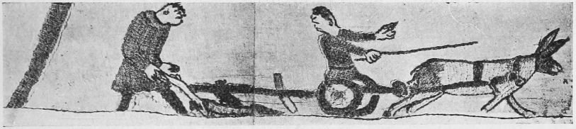 In 36 William has heard the news and promptly determines on revenge. With Bishop Odo at his side, he gives orders that a fleet shall be made ready; the trees are hewn (37, 38), and the ships built (Plate VII.); they are dragged down to the sea (39), arms are carried on board (40), carts with wine and arms are dragged down to the beach, William crosses in a great ship (41, 42, 43), he arrives at Pevensey (44, 45), the horses are disembarked (46), and the knights push on to Hastings (47). The whole story moves along with admirable speed, till the spectator seems to partake in the hurry and bustle of the great expedition. William’s determination is as sure as Harold’s. The difference is that his cause is just. After the arrival at Hastings, the story continues more slowly to its appointed end. That other side of military life is now shown, as necessary as, if less dignified than, the former glimpses. We see the victualling of William’s army. In 47 the soldiers are seizing the neighbouring cattle for food. In 48 is a knight on horseback bearing the name Wadard. He is thought by the designer to be well enough known to need no explanation, but at this distance of time his appearance seems irrelevant. 49, however, carries on the story from 47. The food taken then is now being cooked, the servants serve up the meats which they lay before the soldiery, and Bishop Odo blesses the meat (50). This scene is worked in with real humour; the soldiers are hardly able to restrain their appetite till grace has been said (Plate VIII.). Immediately afterwards (51) are seen Bishop Odo, the Conqueror and his eldest son, Count Robert, the three most distinguished ornaments of the war, seated together in a tent (Plate IX.).