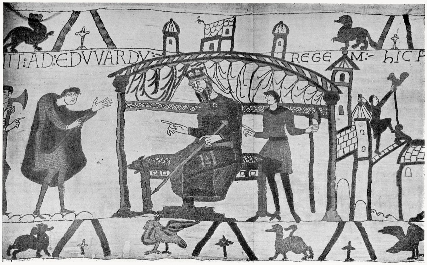THE Bayeux Tapestry is probably the most famous and the most remarkable of mediæval embroideries. In it is given the complete story of a great exploit and one that must always be of particular interest to the English and French peoples—the story of the Norman Conquest. None of the main incidents leading up to the Conquest itself are omitted. The arrival of Harold in Normandy, his stay with William, his swearing of loyalty, his return to England, the death of Edward the Confessor, the subsequent election of Harold to the throne of England, with the expedition itself culminating in the Battle of Hastings, are all shown in the course of the story. It is as much a defence of William’s conduct as a history of his triumph.