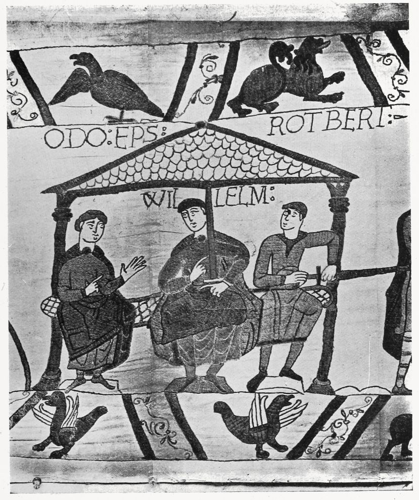 For instance, in 17 occurs the mysterious subject “UBI UNUS CLERICUS ET ÆLFGYVA” (“where a certain clerk and Ælfgyva”). Who Ælfgyva was permits of the widest conjecture; who a certain clerk may have been no one even pretends to know. But it is evident that the subject was sufficiently well known at the time to be inserted quite naturally and without any further explanation. At this distance of time it is impossible to explain the allusion. Again,{10} who were Turold (12), Wadard (49), Vital (62)? They are honoured in the Tapestry with their names above them, and so were evidently thought to be persons of importance. But few can have heard of them to-day. The archæologist Amyot, indeed, discovered that there were three vassals of Bishop Odo called by these names. If these are the people shown in the Tapestry, their appearance would be a compliment to the Bishop as well as themselves. In fact, throughout the story Bishop Odo appears with a prominence that can hardly have been attractive to his illustrious brother. Not only do his three servants appear in this way, but in 54 he is seated in state with the Conqueror and the Conqueror’s eldest son, Count Robert, while in the crisis of the battle it was Odo, not William, who rallied the troops and turned into victory what had seemed certain defeat. Again, when William was giving his orders for the preparation of the Expedition (41) Odo stood by his side ever ready with advice. It may be remembered what William thought later of the ambition of his brother, and how some time after the Conquest was over he sent him packing back to his Bishopric. Odo was certainly a great benefactor to his Cathedral of Bayeux, and the prominence given to him has been used as an argument that the Tapestry was ordered by him and the design made by an artist intent on the gratification of his lord.{11}