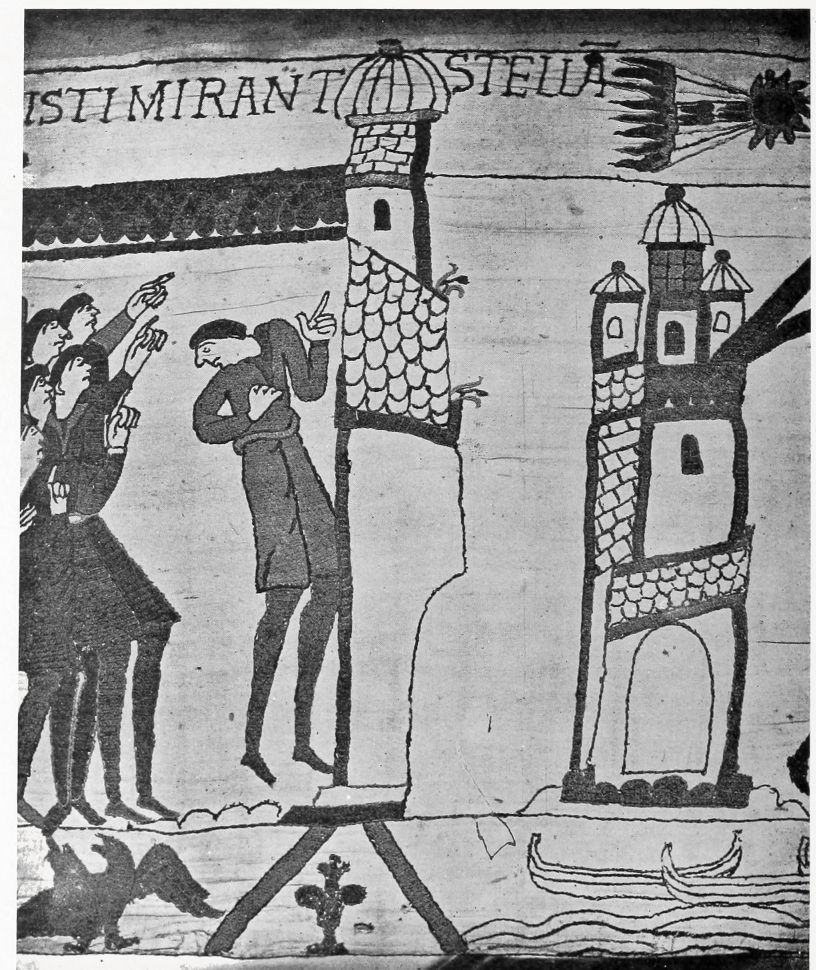 At this point the story as told in the Tapestry falls quite naturally into two parts. So far the unscrupulous conduct of Harold has been crowned with success. His ambitions are realised, and he sits on the throne of England. Omens, however, are not wanting to foreshadow the shortness of his reign. The second part of the story will show how William came into his own.