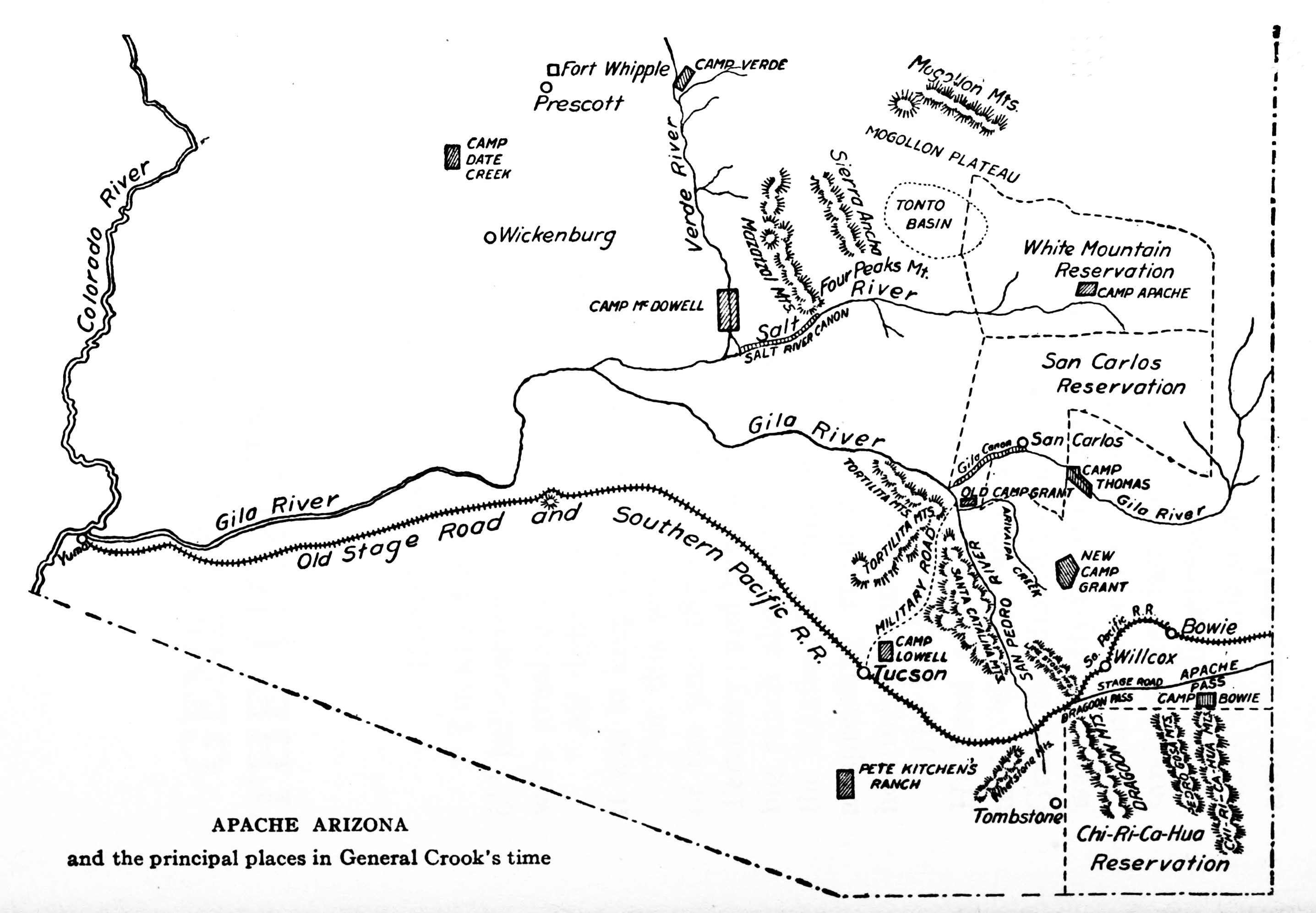 Suspecting that they were to get no terms at all, now, and to show that they despised the soldiers, Geronimo and Nah-che went thoroughly bad. Perhaps General Crook’s methods might have been better; perhaps not; but toward the last of April Geronimo and Nah-che led their few warriors straight up past Tucson itself; the troops had not been able to protect the border, and Nah-che penetrated clear to Fort Apache.