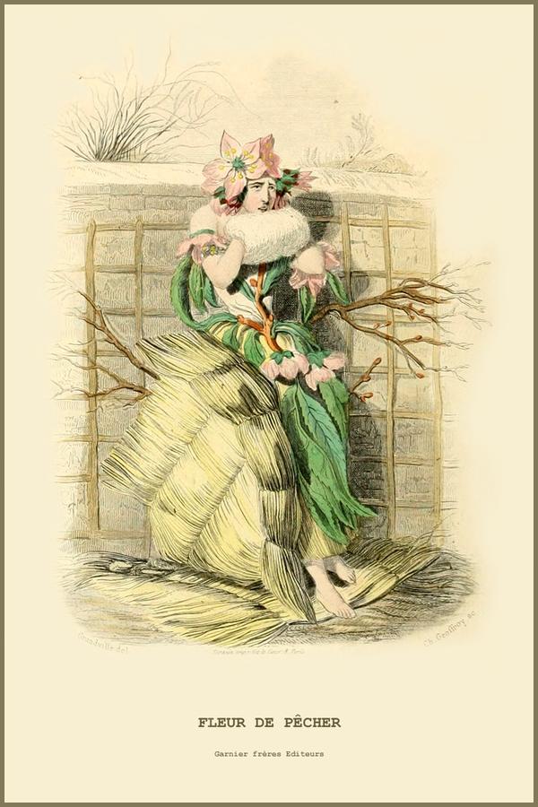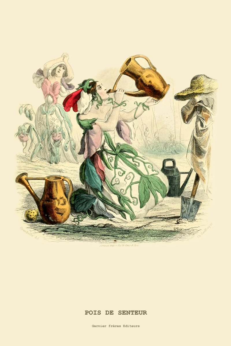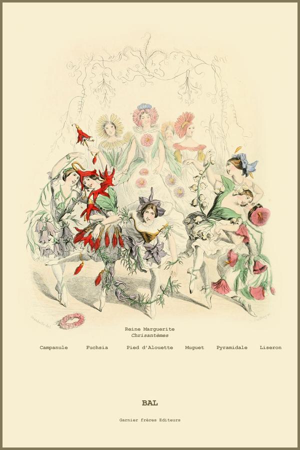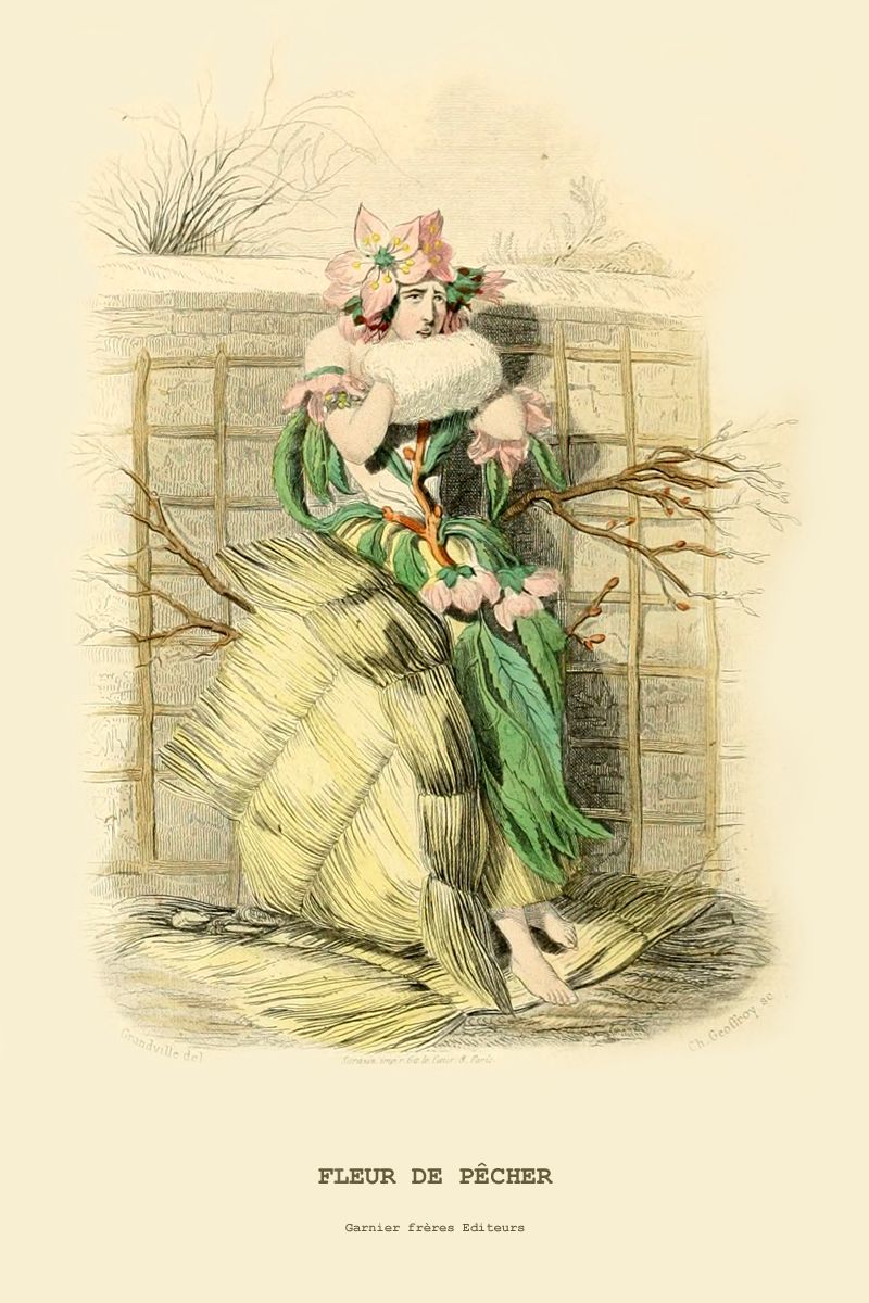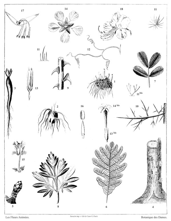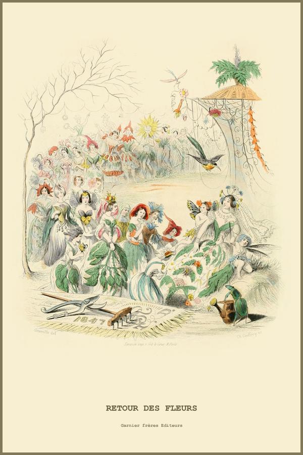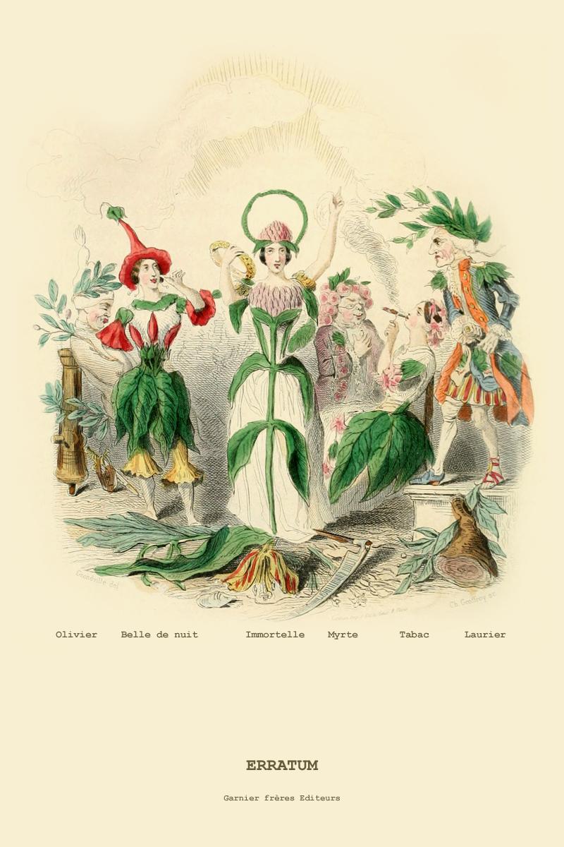 Au carrefour d’une forêt, à l’endroit d’où partent quatre routes différentes, plusieurs Fleurs se rencontrèrent, parmi lesquelles on remarquait le Pois de Senteur, le Cactus, la Fleur de Pêcher, le Dahlia, la Sensitive, la Fuchsie, la Pervenche.