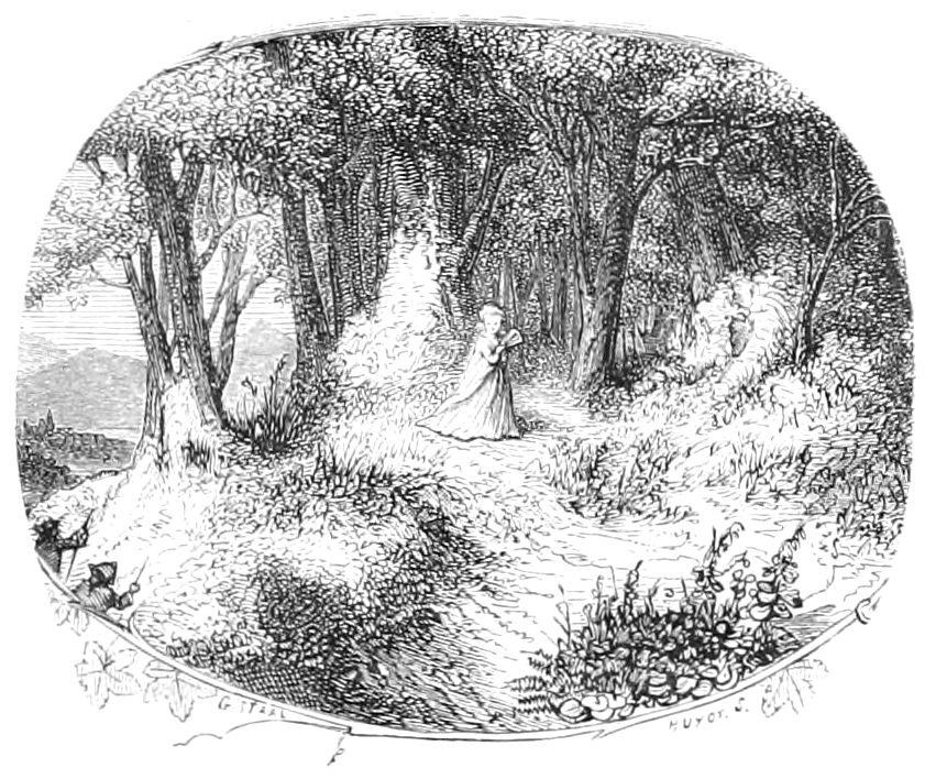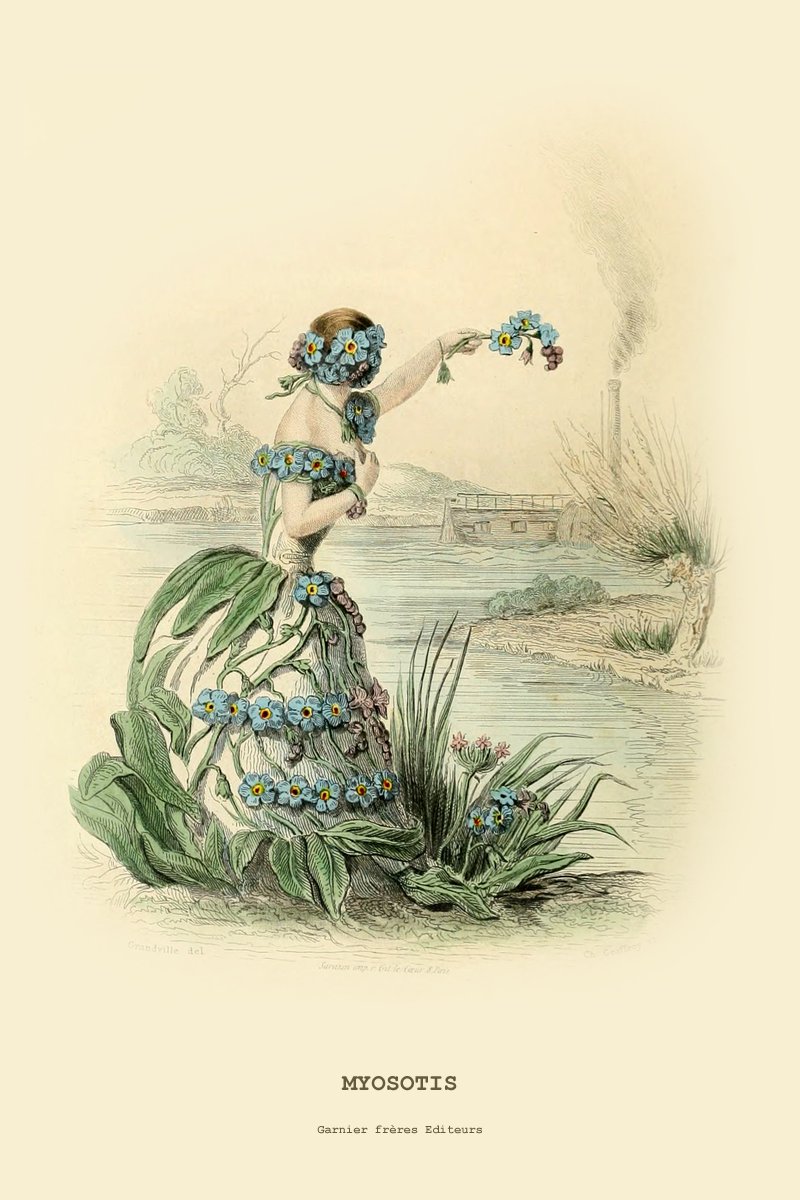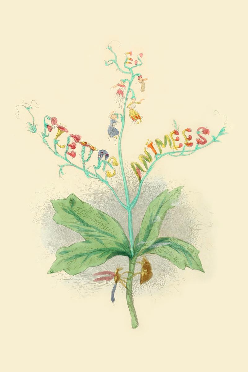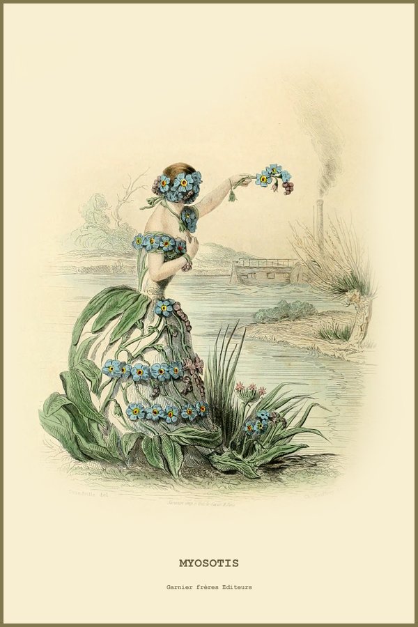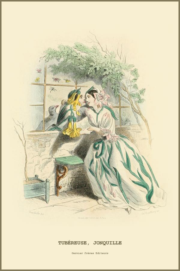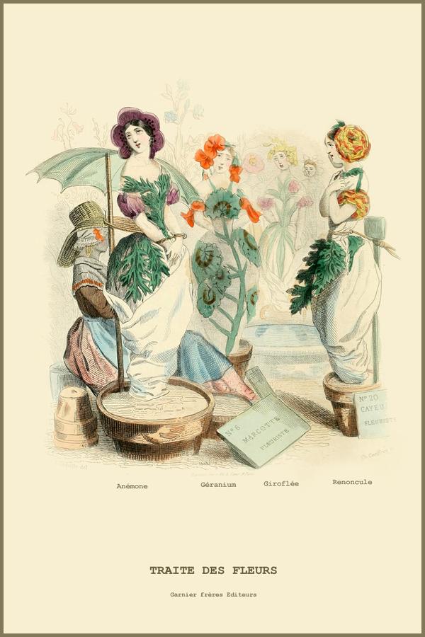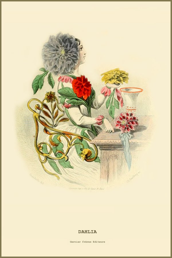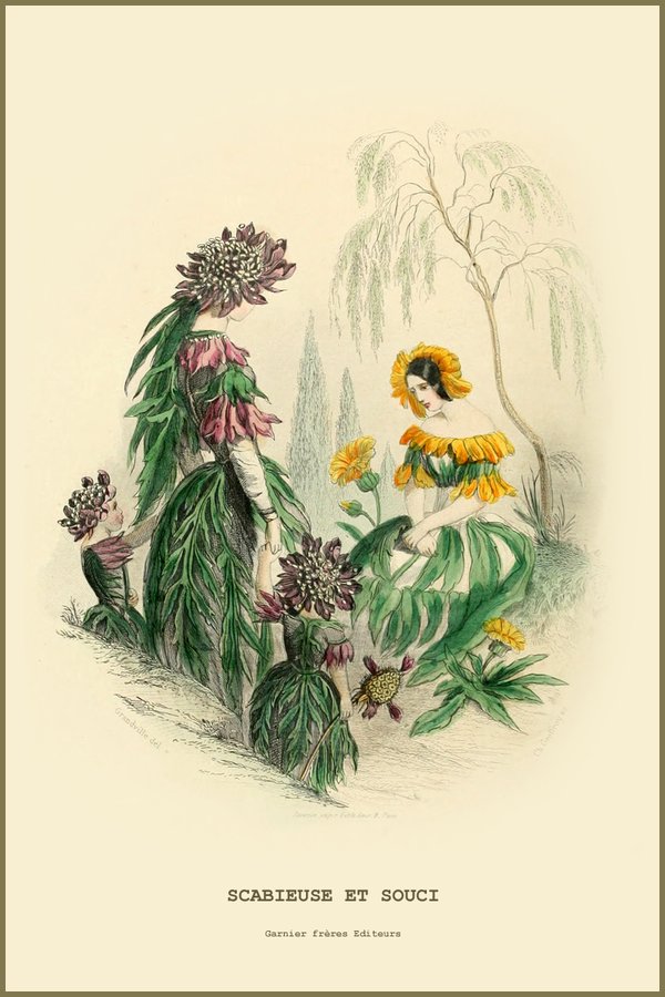 Au carrefour d’une forêt, à l’endroit d’où partent quatre routes différentes, plusieurs Fleurs se rencontrèrent, parmi lesquelles on remarquait le Pois de Senteur, le Cactus, la Fleur de Pêcher, le Dahlia, la Sensitive, la Fuchsie, la Pervenche.