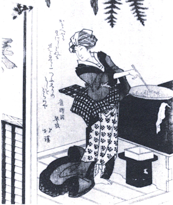 Young maidens carrying flat bamboo baskets make excursions into the country to gather the seven spring grasses (nanakusa). These greens, the water drop-wort, shepherd’s purse, radish, celery, dead-nettle, turnip and rock-cress, are the components which are needed for the celebration of the first of the five festivals known as Go-sekku. This one occurs on the seventh day of the first month.