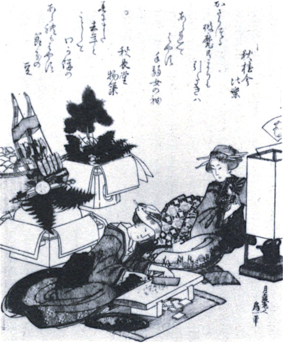 In the background of this picture, a set of bows and arrows used for indoor practice may be seen leaning against a basket filled with square rice cakes. In the foreground, a woman is seated before a chopping board on which she cuts the rice cakes into small pieces. Being small and hard, these bits are known as “hail mochi.” In some parts of Japan, it is customary{7} to eat them on the third day of the festival. A companion who holds up a picture of the Sun Goddess, is seated near a lantern, on the base of which rests a waterpot. It is likely that this vessel contains the “young water” (hatsumizu) used for the New Year’s tea (fuku cha, “good luck tea”). Custom decrees that this water must be drawn from the well before the sun’s rays strike it. An offering of rice is sometimes first thrown into the well. With the tea is served a preserved plum (umeboshi), which, because of its wrinkled skin, suggests the hope of a good old age. In addition, there is always served on this festive day a fish stew known as zoni, and a special spiced brand of wine called toso. In some households the first day is devoted entirely to family devotion. Before the ancestral shrine offerings of tea, mirror dumplings, zoni and toso are placed, and then each living member is served in order of age with the same viands. With the same respect for age, New Year’s greetings are spoken first to the shrine, then to grandparents and parents and so on down to the smallest child.