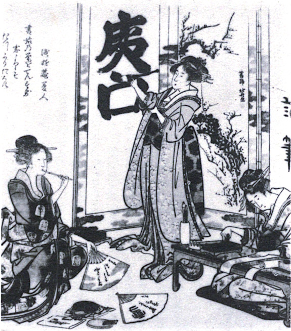 While the young people enjoy these pastimes out of doors, within the house the older members of the family indulge in the writing of a New Year’s poem or in playing one of the games described in the next section of this leaflet. The writing of poems at this auspicious time is almost universal, indeed, the composing of poetry and the mastery of caligraphy are considered as necessary accomplishments for the cultured person. The most common form of New Year’s poem is that known as tanka. It is a poem of five lines, the first and third of which contain five syllables,{10} the other three seven, and is the poem almost always found on surimono. Poems are often inscribed on fans as in Fig. 5, where one young woman meditates over the verse which she has written on a fan. A companion seated at a writing table, is grinding ink with one hand and holding with the other a poem paper (tanzaku). Such long strips are to be seen in many houses awaiting the New Year’s inspiration. They are sometimes tinted to a soft shade or ornamented with appropriate New Year’s flowers or with silver clouds as in this case. One of the poems accompanying this surimono is worthy of translation: “From the window, lighting the brush for the first writing, the plums’ fragrance on the wind is blowing.”