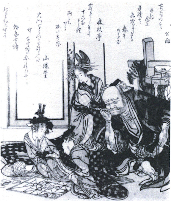 Sugoroku (“double sixes”) is similar to the European “race-game.” It is played with dice and the succeeding spaces on the board generally represent the stations of a journey. Brinkley, in his Japan and China (Vol. VI, p. 56), tells us that this game was imported from India in the eighth century and was at first prohibited on account of its gambling character. Eventually the Buddhist priests took it up and converted it into an instrument for inculcating virtue by making the spaces on the board represent a ladder of moral precepts which marked the path to victory. Sugoroku, with the travel board, is commonly played by children at New Year’s time. The name is also given to the more difficult game of backgammon which may be studied in one of the surimono in this museum. The board on which the game is being played is now obsolete. It is divided longitudinally into two fields with an intervening space between. Each field has twelve narrow subdivisions in which the men are placed.