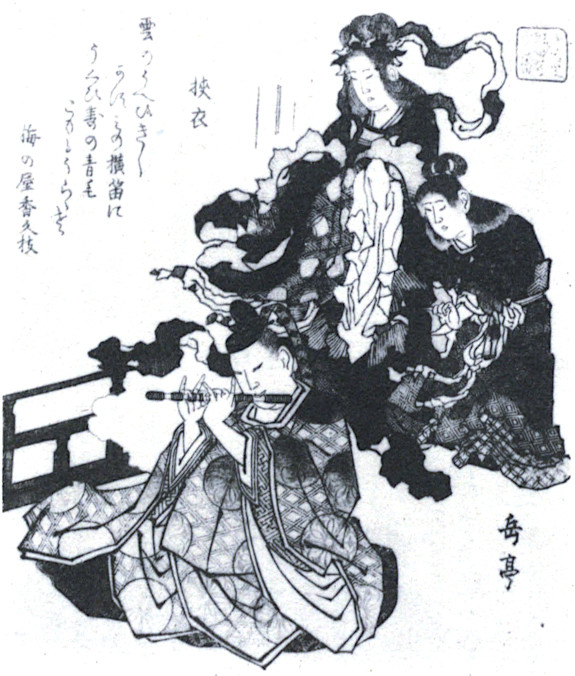 Most of the musical instruments, which both men and women enjoy playing, are importations from China, particularly the lyre (koto), the violin (kokyū) and the reed organ (shō). The samisen, a three-stringed guitar, is the popular accompaniment of the singing girl or geisha; the koto is played by the more aristocratic women. Drums of double conical form (tsuzumi) are to be seen in the hands of both men and women. Flutes have long been popular with men of all classes, the wandering minstrel, the court musician{16} and even the courtier himself who delighted to match the softness of his flute tone with the gentle light of the moon, or with the voice of the harbinger of spring as evidenced by the poem on Fig. 7 which reads: “Like the nightingale’s voice above the clouds, hazed over by the mist, the flute contains sweetness.”