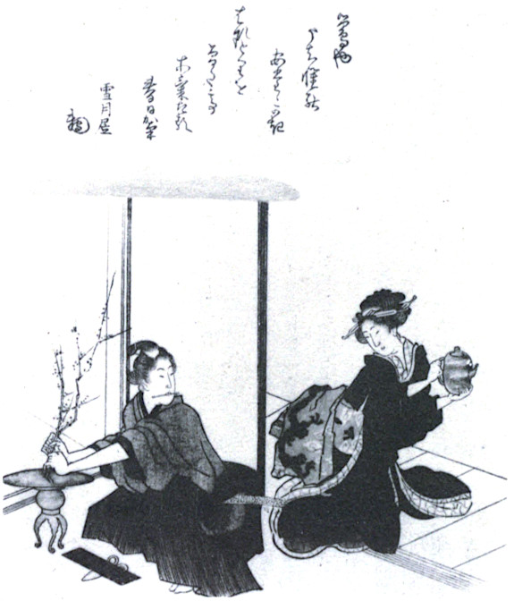 Tea drinking was introduced from China in the ninth century and at first was practised by the Buddhist priests for medicinal purposes and especially as a means of keeping awake during meditations. In the fifteenth century meetings for tea drinking were held in groves and gardens. In an adjoining tea house pictures were shown on these occasions which were mainly Buddhistic in subject, and most of them of Chinese origin. Under the great tea-master Rikyū (sixteenth century) the rules of cha no yu were rewritten. From this time on the ceremony was performed in a small house with a low door through which the few guests would have to prostrate themselves for entrance. The most characteristic traits of these gatherings were a close sympathy with nature and a love of simplicity almost amounting to ruggedness as expressed in the tea bowls often partially glazed. Restraint was likewise displayed in the decorations{17} of the room, a simple bamboo flower holder was preferred to the bronze vase, and a hanging picture (kakemono) was chosen which would make an equally quiet appeal, such as a branch in the wind or an example of fine caligraphy. The occasion became a time in which to worship purity and refinement.