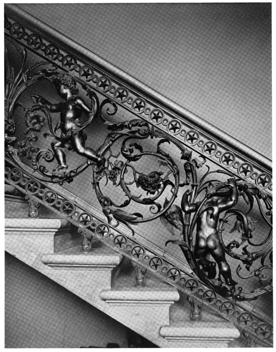 So long has the name Brumidi been associated with the lovely cherubs about the Capitol Building that even this bronze staircase has come to be called a “Brumidi Stairway.” Two such Brumidi stairways lead from the House Chamber and two from the Senate Chamber. Hazelton wrote in 1897, “Brumidi made the attractive designs of the eagle, deer, and cherubs for all the railings upon paper; they were modeled by Baudin and cast in Philadelphia.” Mr. Baudin wrote from Philadelphia to Captain Meigs in 1857, “...I am waiting for the drawings for the stair rail....”