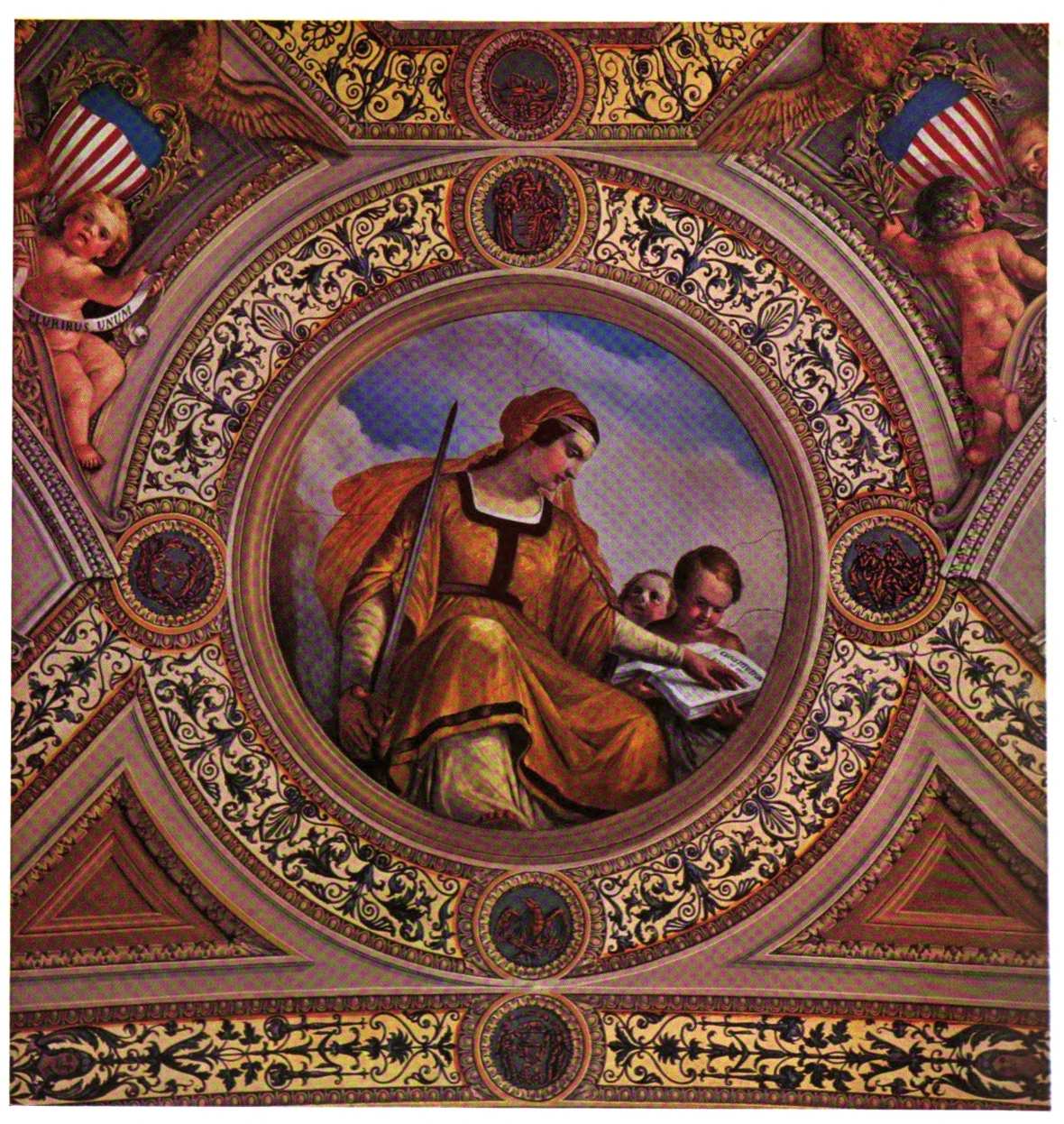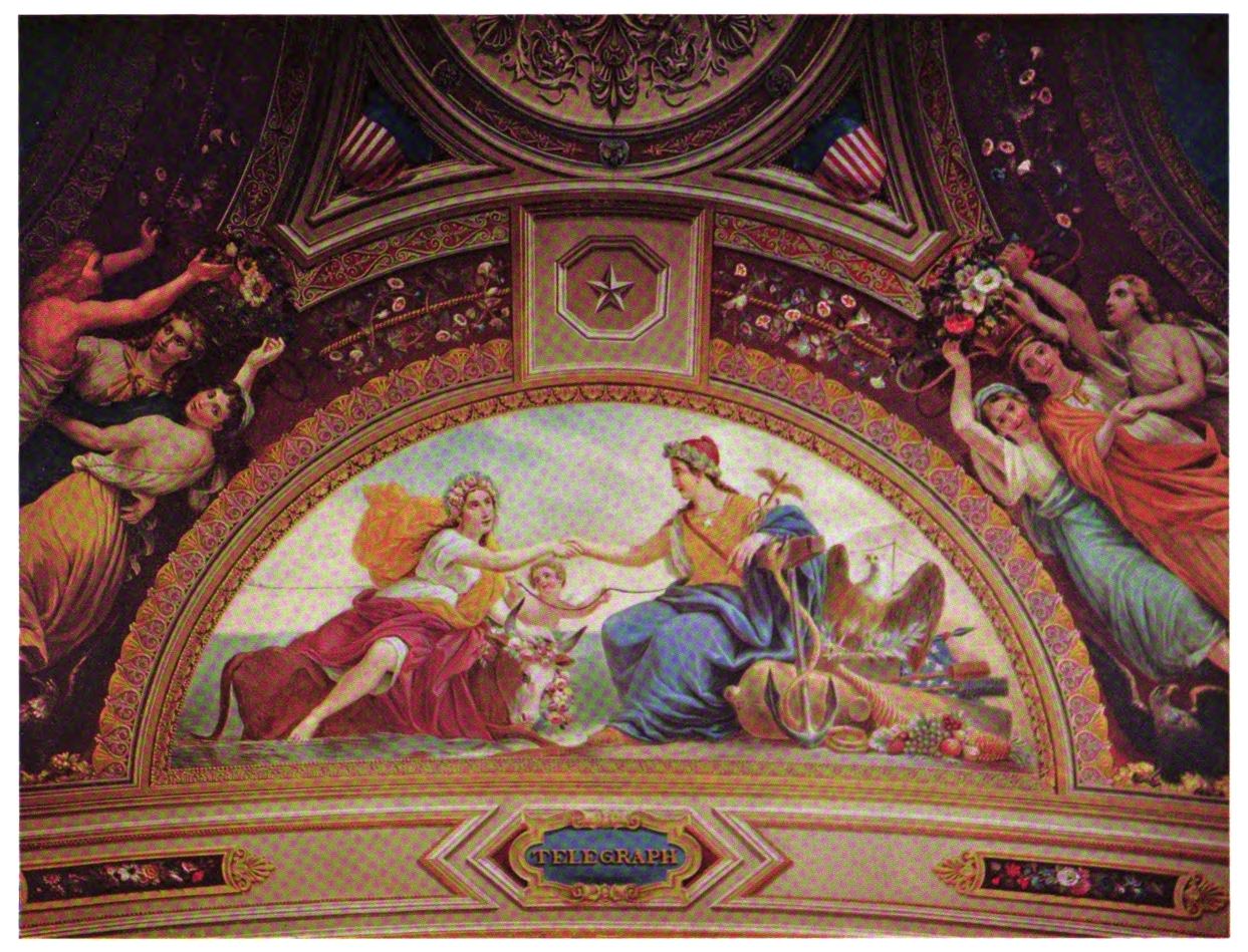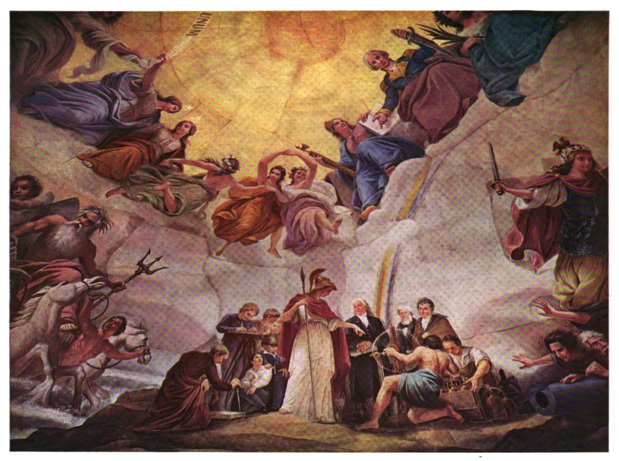 The early settler in North America had little opportunity for monumental painting. The austerity of religious belief dominating many new world settlements, infused as they were with the spirit of the Reformation, afforded meager encouragement to its development. American artists, following Benjamin West to England, leaned heavily upon British custom and precedent. West’s pupils—Charles Willson Peale, Gilbert Stuart and Joseph Wright—became makers of likenesses, and liberty-loving John Trumbull pursued historical painting to produce four of the eight great framed pictures of the Rotunda of the Capitol. Contrasted with Brumidi’s paintings, these mark the difference between the easel picture, a loosely related, detachable embellishment, and mural decoration designed in scale and color especially to enhance architecture.