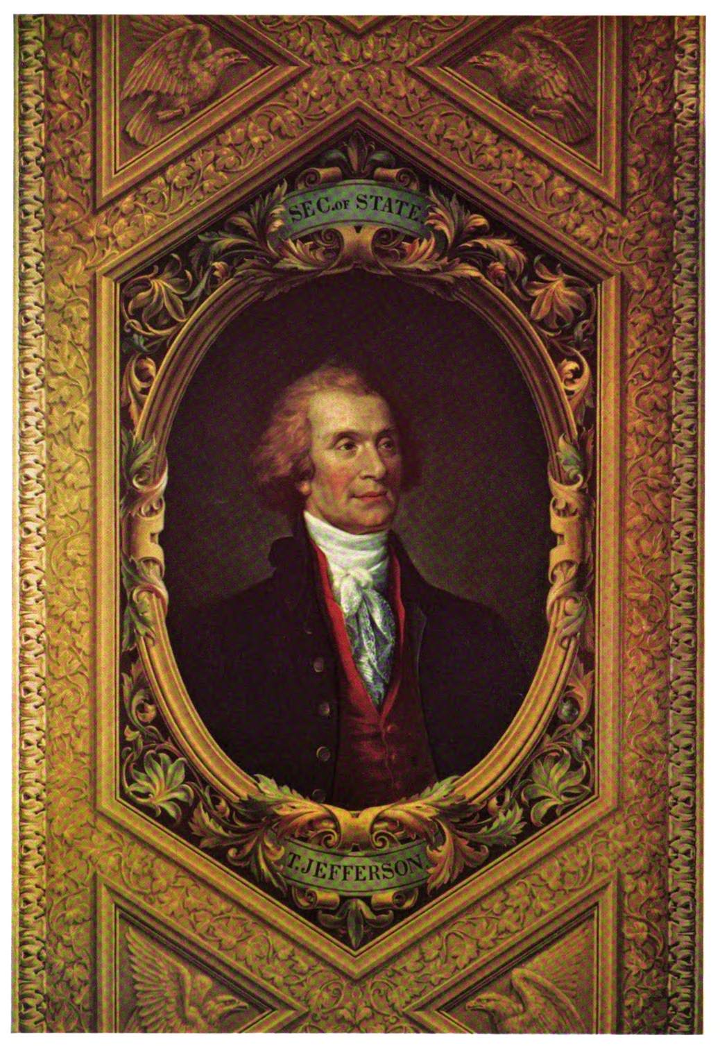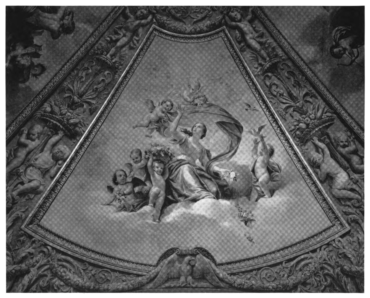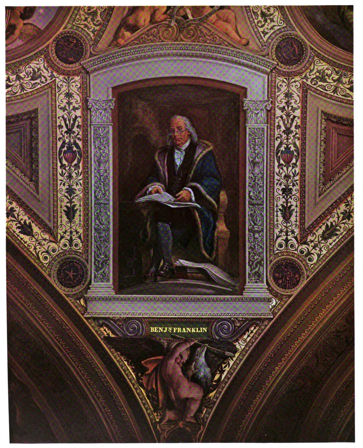 The early settler in North America had little opportunity for monumental painting. The austerity of religious belief dominating many new world settlements, infused as they were with the spirit of the Reformation, afforded meager encouragement to its development. American artists, following Benjamin West to England, leaned heavily upon British custom and precedent. West’s pupils—Charles Willson Peale, Gilbert Stuart and Joseph Wright—became makers of likenesses, and liberty-loving John Trumbull pursued historical painting to produce four of the eight great framed pictures of the Rotunda of the Capitol. Contrasted with Brumidi’s paintings, these mark the difference between the easel picture, a loosely related, detachable embellishment, and mural decoration designed in scale and color especially to enhance architecture.