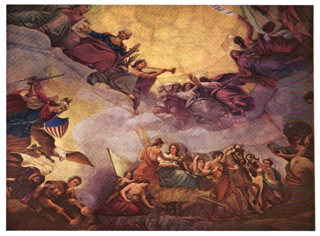 “May I not be pardoned some brief mention of the wonderful genius, so long, so gently, and so beautifully associated with this Capitol? He died poor, without money enough to bury his worn-out body, but how rich the inheritance he has left to the present and succeeding ages! During more than a quarter of a century he hovered along these walls from the basement to the Dome, leaving creations of imperishable beauty wherever his touch has been. Wherever he paused by a panel, or was seen suspended to a ceiling, there soon appeared the brilliant conceptions of his fertile and cultivated mind. We can form no correct idea of the extent, the variety, and the perfection of his taste and skill as an artist without sometimes forgetting our pressing cares, as we look in detail over his field of labor.”