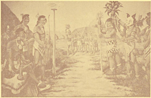 Green Corn Ceremony of prehistoric Caddo Indians. Presumed village, dress, and utensils about A.D. 1000 as reconstructed from archaeological findings. Mural in Louisiana State Exhibit Museum, Shreveport.