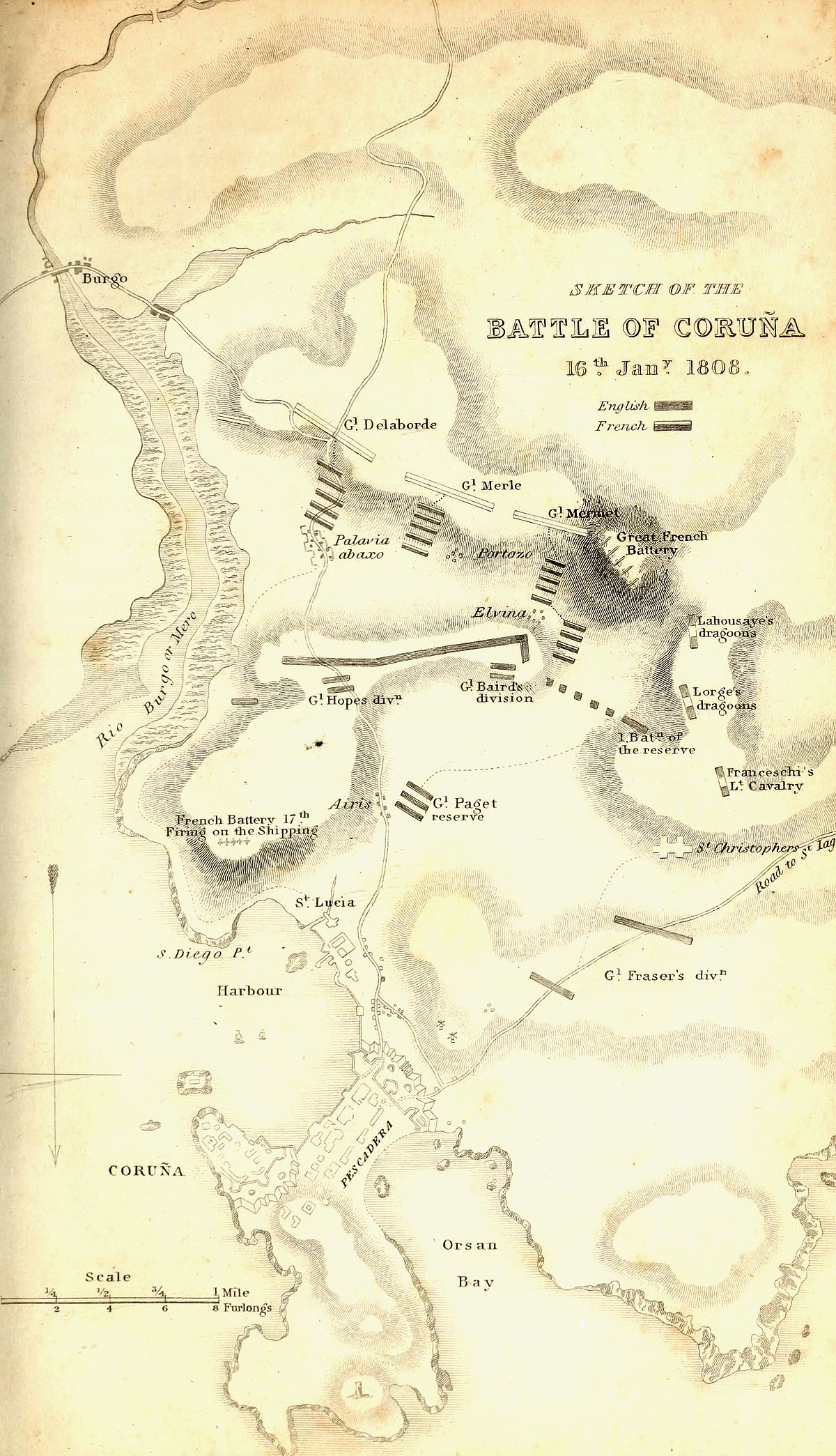 [16] Sir Walter Scott, in his Life of Napoleon, inaccurately asserts, that sir John Moore, “sent ten thousand men, under sir David Baird, by sea, to Coruña,” and that “the general science of war, upon the most extended scale, seems to have been so little understood or practised by the English generals at this time, that instead of the country being carefully reconnoitred by officers of skill, the march of the army was arranged by such hasty and inaccurate information as could be collected from the peasants. By their reports general Moore was induced to divide his army”——What “the general science of war upon an extended scale” may mean, I cannot pretend to say; but that sir David Baird was sent by the government from England direct to Coruña, and that sir John Moore was not induced by the reports of the peasants to divide his army, may be ascertained by a reference to the Appendix, No. 13, section 2.