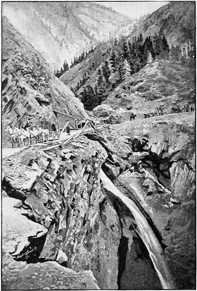 Chippeta Falls.—A beautiful waterfall near the east end of Black Cañon, that plunges from the summit of the cañon wall, descending in a sheet of snowy spray to the Gunnison River below.