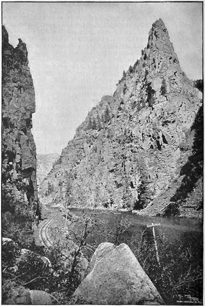 Black Cañon.—Twenty-five miles west from Gunnison. Along many miles of this grand gorge the railroad lies upon a shelf hewn from the living rock, which rises frequently to an altitude of over two thousand feet. The cañon is sixteen miles in length, and abounds in many striking features.