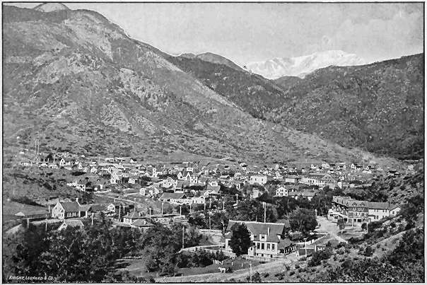Beyond Palmer Lake, on both sides of the track, may be seen wonderful formations of brilliant red sandstone, taking the form of castles, fortifications and towers. One of the most striking of these has been named Phœbe's Arch, being a great castle-like upthrust of glowing red rock, through which there is a perfect natural archway. The descent of the Divide to Colorado Springs is through an interesting country, the mountains to the west and plains extending to the east. As Colorado Springs are approached, the great gateway to the Garden of the Gods can be seen to the right, and Pike's Peak, rising to an altitude of 14,147 feet, its summit white with snow, attracts instant attention. A side trip can here be taken, at nominal expense, to Manitou Springs, five miles distant, the famous watering place of the west, a pleasure resort possessing wonderful effervescent and medicinal springs, and surrounded by more objects of scenic interest than any resort of a like character in the old or new world, including "Garden of the Gods," "Glen Eyre," "Red Rock Cañon," "Crystal Park," "Ruxton's Glen," "William's Cañon," "Manitou Grand Caverns," "Cave of the Winds," "Ute Pass," "Rainbow Falls," "Bear Creek Cañon," "Cheyenne Mountain," "Pike's Peak," and hundreds of others, to name which space is lacking.