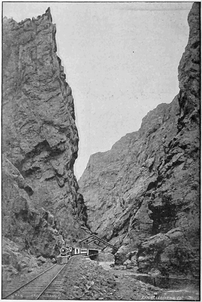 The Royal Gorge.—The climax of all the grandeur of the Grand Cañon of the Arkansas lies midway in this wonderful chasm. The best view can be obtained from the famous hanging bridge. Here the walls of the cañon rise to a perpendicular height of 2,600 feet above the track.