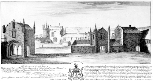 For the most noble John, Duke and Earl of Bedford, Marquess of Tavistock, Baron Russel of Thornbaugh, and Baron Howland of Streatham. Proprietor of these Remains. This Prospect is humbly Inscrib’d by Your Grace’s most Dutiful, and Obedient Servants, Saml & Nathl Buck. Ordigarius or Orgarius Duke of Devonshire & Cornwall, whose Daughter was married to K. Edgar, Very probably kept his Court here, till his son Odulph built this Abbey Anno 961, for then the whole Mannor of Tavistock, & Jurisdiction thereof, were given to the Monastery with view of Frank Pledge, Gallowes Pillory assize of Bread Beer &c. The Church was dedicated to St. Mary &. St Rumon. The Danes burnt it but it was soon rebuilt, In the Reign of Ed. I. The abbot claim’d the aforesaid Priveleges, which were by that King allow’d & confirm’d. There were some famous Men Abbots thereof, particularly two Bishops & one Earl of Devonshire; of the Courtenay family, Lectures were herein read in the Saxon language to preserve it in Memory; it was of the Dignity of the Mitred Abbots, who sat as Barons in Parliament. Their Power and Priveleges continued till the Dissolution by K. H. 8. who gave it to John L’d Russel, in which Noble Family it still continues. Annual Value £902 5 7¾.