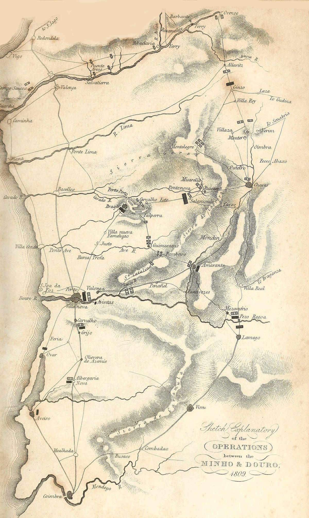 | Coruña and Ferrol surrender to Soult—He is ordered, by the emperor, to invade Portugal—The first corps is directed to aid this operation—Soult goes to St. Jago—Distressed state of the second corps—Operations of Romana and state of Gallicia—Soult commences his march—Arrives on the Minho—Occupies Tuy, Vigo, and Guardia—Drags large boats over land from Guardia to Campo Saucos—Attempt to pass the Minho—Is repulsed by the Portuguese peasantry—Importance of this repulse—Soult changes his plan—Marches on Orense—Defeats the insurgents at Franquera, at Ribidavia, and in the valley of the Avia—Leaves his artillery and stores in Tuy—Defeats the Spanish insurgents in several places, and prepares to invade Portugal—Defenceless state of the northern provinces of that kingdom—Bernadim Friere advances to the Cavado river—Sylveira advances to Chaves—Concerts operations with Romana—Disputes between the Portuguese and Spanish troops—Ignorance of the generals | 162 |
