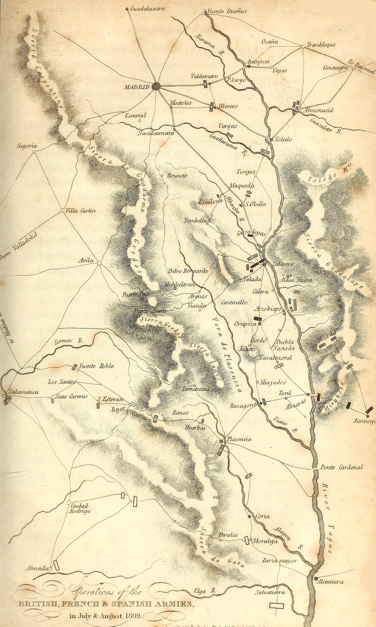 | The king goes to Illescas with the fourth corps and reserve—Sir R. Wilson advances to Escalona—Victor retires to Maqueda—Conduct of the Spaniards at Talavera—Cuesta’s cruelty—The allied generals hear of Soult’s movement upon Baños—Bassecour’s division marches towards that point—The pass of Baños forced—Sir A. Wellesley marches against Soult—Proceedings of that marshal—He crosses the Bejar, and arrives at Plasencia with three corps d’armée—Cuesta abandons the British hospitals, at Talavera, to the enemy, and retreats upon Oropesa—Dangerous position of the allies—Sir Arthur crosses the Tagus at Arzobispo—The French arrive near that bridge—Cuesta passes the Tagus—Combat of Arzobispo—Soult’s plans overruled by the king—Ney defeats sir R. Wilson at Baños, and returns to France | 410 |