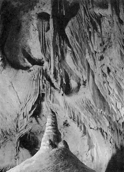 In an adjoining area is the celebrated Rock of Ages, a gigantic stalagmite, stately in position and dramatic in location, thought to be one of the oldest forms in the Caverns, although its exact age is not known. For years it marked the end of the Caverns Tour, and an impressive ceremony conducted by the guides consisted of a short talk followed by the singing of the old favorite, "Rock of Ages." No visitor could ever forget this inspirational ending to a breath-taking tour of God's underground handiwork. The Rock of Ages became almost a symbol of the Caverns tour in the minds of those who had taken it. But, as the crowds of visitors increased, the park officers found they could not continue this service.