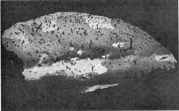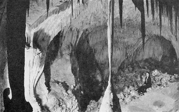 The rest period is over. It is time to go on. In a moment the party is once again assembled in the main passageway section which connects the many rooms, and turns to the left past "hanging mosses" and honeycombed fissures into the famous Big Room, largest underground chamber known anywhere, and unsurpassed in length, width and height, variety and size of formations, number of colors to be seen, and value to geologists due to the many finds that have been made.