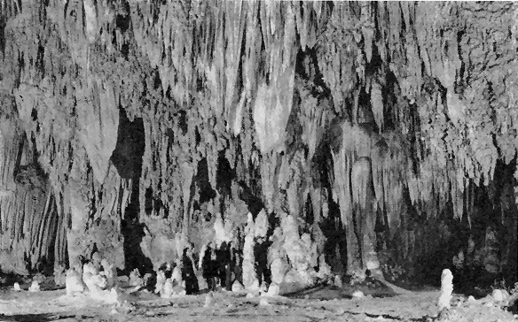One unique and different formation is known as the Queen's Draperies, which are found at the southwest side of the room. They are a form of massed stalactites grown together so evenly that they resemble a huge drape from which the wrinkles haven't been ironed out. But the unusual feature is the ability of this stone to absorb light and reflect it moments after the light has been extinguished. These portieres are the highest in the Caverns, being slightly over 40 feet. Throughout the rest of the room one feels as though he must have interrupted Mother Nature while she was busily experimenting and trying to decide what to do next, having left behind her first efforts for the world to see.