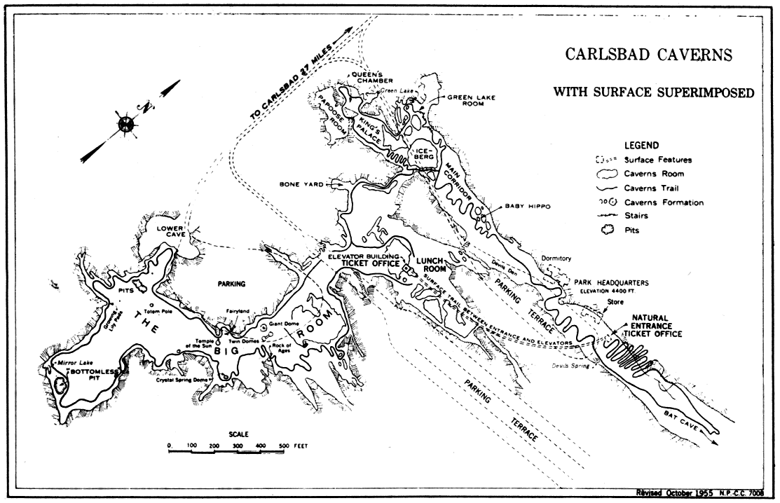 No dogs are allowed in the Caverns. They may be kept in the kennels provided for the purpose at a nominal charge. Cameras may be used on the surface, but within the Caverns they may be used only on the special photographic tour, full information concerning which may be obtained from the superintendent's office.