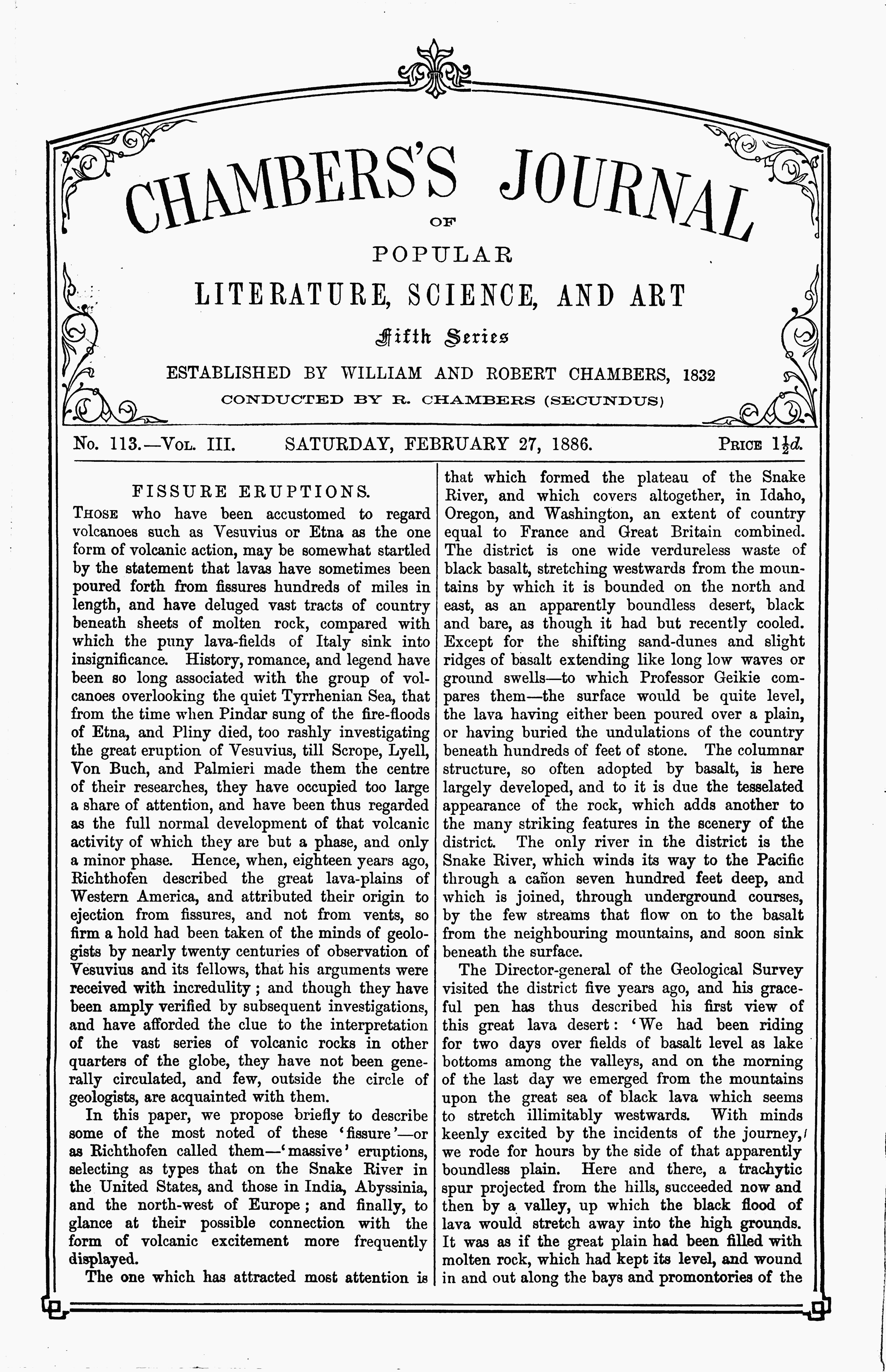 Title: Chambers's Journal of Popular Literature, Science, and Art, Fifth Series, No. 113, Vol. III, February 27, 1886