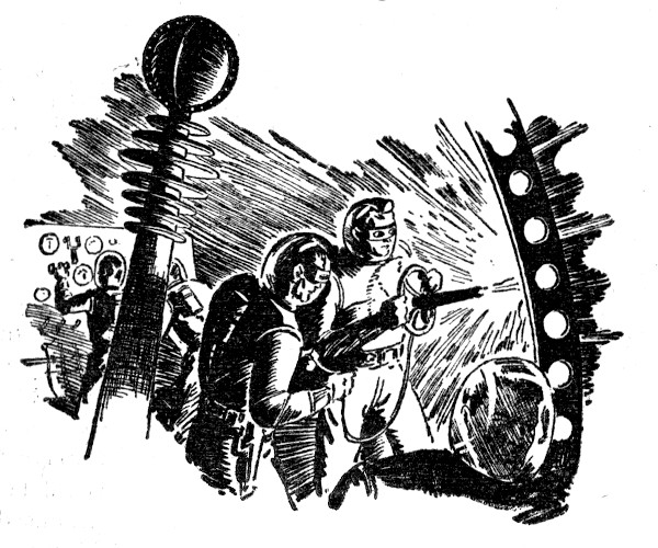Bennington smiled inwardly. To have Don Channing asking him for orders was like having Captain Johannson request the batteryman's permission to change course. "If you can find and remove the place where the shorted line is, and then splice the lighting circuits again, we'll have a big hunk of our work done. The rest of us will begin to take lines off of the pilot's circuits right here in the instrument room so that our jury-controls can be hooked in. You'll need a suit, I think, because I'll bet a hat that the shorted line is in the well."