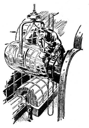 Hadley cracked an air valve beside a circular air door. The hiss of entering air crescendoed and died, and then Hadley cracked the door that opened in upon the huge driver tube. With casual disregard for the annular electrodes that filled the tube and the sudden death that would come if the pilot sent the driving voltages surging into the electrodes, Hadley climbed to the top of the tube and used a spanner to remove four huge bolts. A handy differential pulley permitted him to lower the near-exhausted cathode from the girders to the air door where it was hauled to the deck. A fresh cathode was slung to the pulley and hoisted to place. Hadley bolted it tight and clambered back into the ship. He closed the air door and the valve, and then opened the valve that led from the tube to outer space. The tube evacuated and Hadley spoke once more to the pilot room.